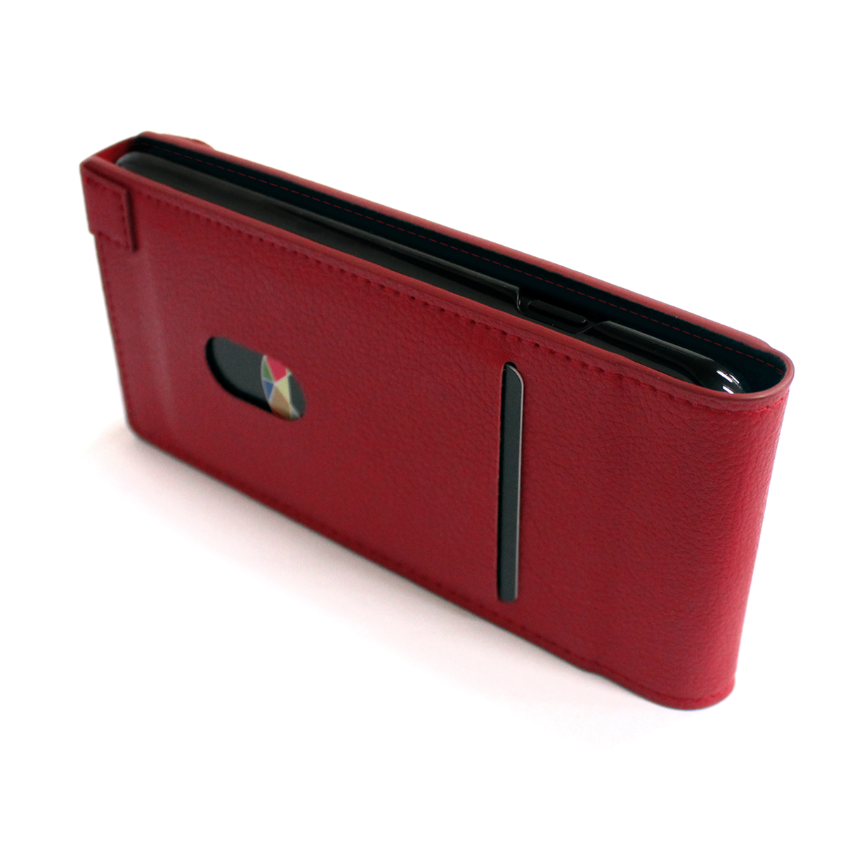 このケース、カバーが2つ折り携帯のように縦に開くタイプ。エコ素材で手触りが良いプレミアムイタリアンレザーを使用し、グリップ感は良好です。