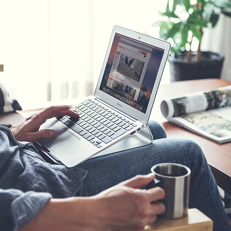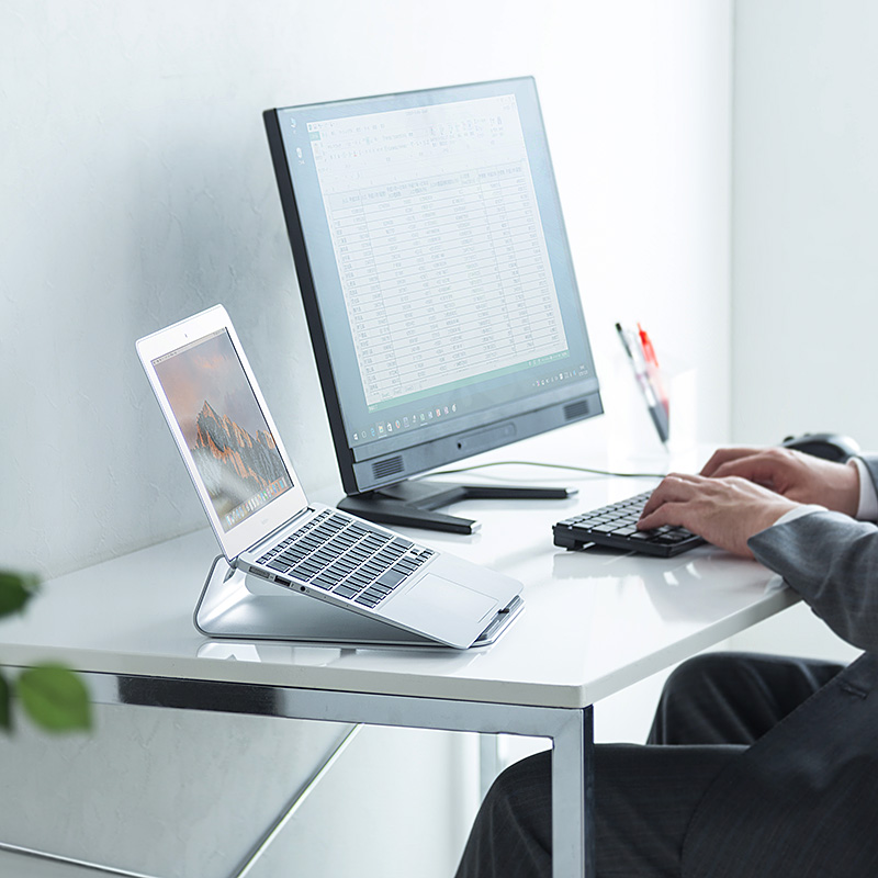 ノートパソコンの構造上、自然と画面を見下ろすカタチになってしまいます。その猫背の姿勢が肩こりなどの原因になることも。その点、ノートパソコンスタンド「200-STN024S」は18度の角度がついているので、視線が上がり、姿勢を正すことができます。