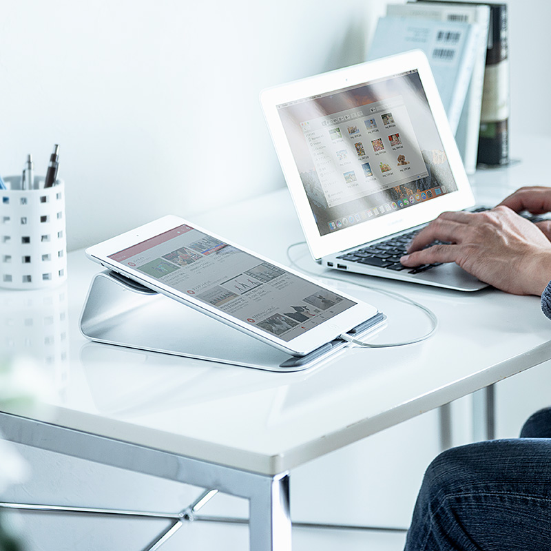 約W211×D239×H68mmで、重量は約540g。11~15インチのノートパソコンやiPad、本体の長さが約17cm以上のタブレットに対応した「200-STN024S」は3280円です。