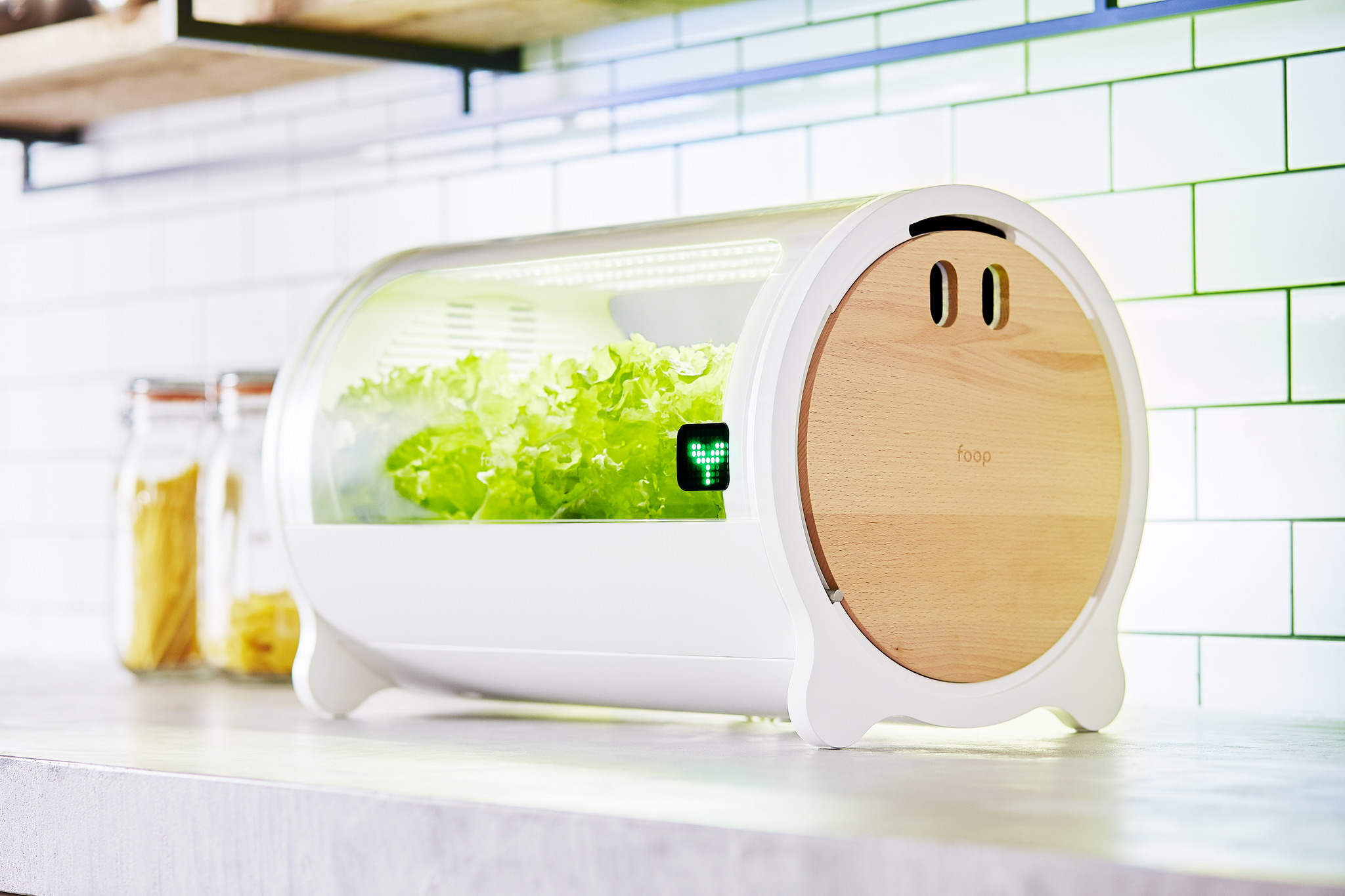 「foop」(価格:5万2380円~)は、レタスやハーブ、ベビーリーフなど、15cm以下のさまざまな葉物野菜を水耕栽培することができるインテリアアイテム。スマートセンサーが光の強さやCO2の濃度、温度から湿度情報までモニタリングし、太陽光に近い光質を出すLEDライトやエアーポンプ、送風ファンが自然以上の理想的な環境をつくりだして、栽培をサポートしてくれます。