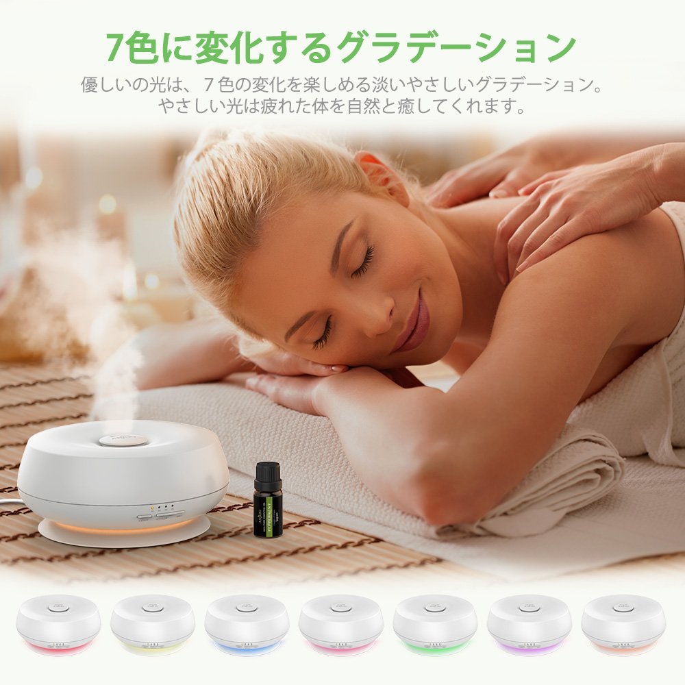 さらに嬉しいのがインテリアとしての機能。アロマライトは7色に変化するグラデーションで、見ているだけで心も身体も癒されます。シンプルな本体デザインだから部屋で過度な主張をすることがないのもいいですね。