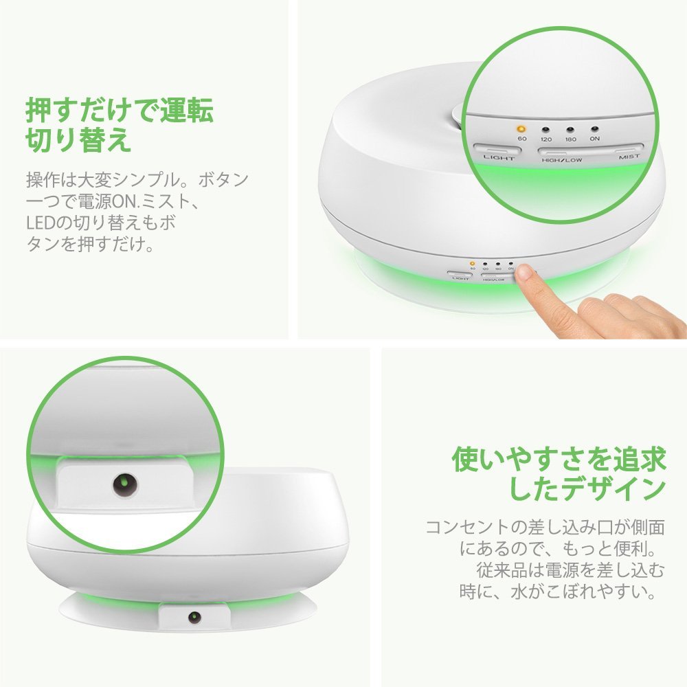 また、音が静かなうえ、1・3・6時間のタイマーが付いており、就寝時にピッタリ。超微粒のミストは熱を持たず、火傷の心配がないので、子ども部屋での使用にもうってつけです。