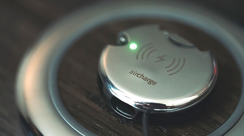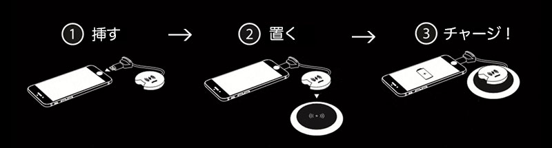 本製品はコネクタを使わず、チャージャーにおくだけでワイヤレスで充電できるキーリング型のレシーバー。内部に収納したケーブルを使って給電したいデバイスと接続、あとはQi(チー)規格のワイヤレス充電器に置くだけで充電を開始します。