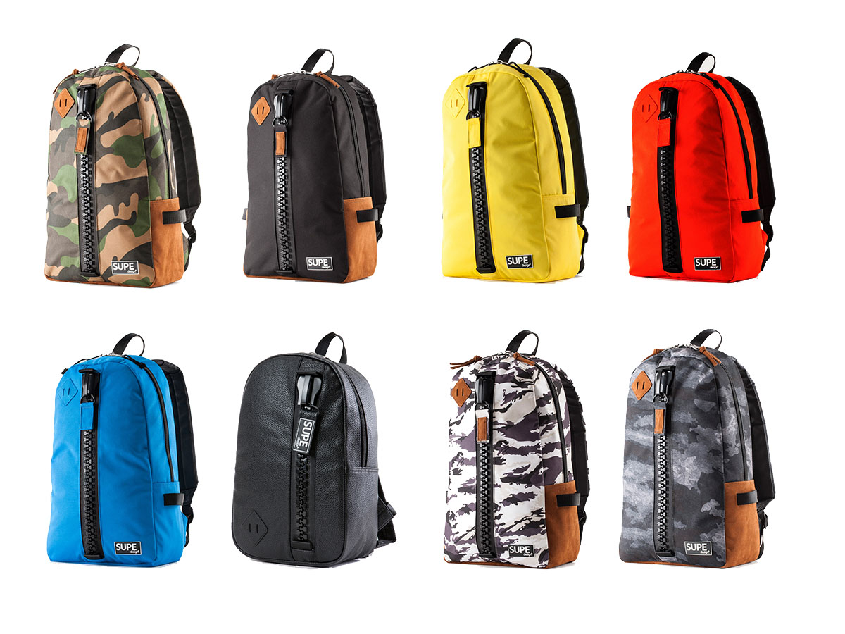 「SUPE design」は2012年、イタリア人アレッサンドロ・ベルーチと日本人の河合宣彦の手により誕生したブランド。ブランドの象徴でありデザインアイコンともいえる「THE ORIGINAL MEGAZIP」=巨大なジップは、もともとの戦車のカバー用に使われていたもの。戦地から日常使いのバックパックへと活躍する場を移したメガサイズのジップには「世界平和の象徴として、人々と世界を旅してほしい」との願いが込められています。