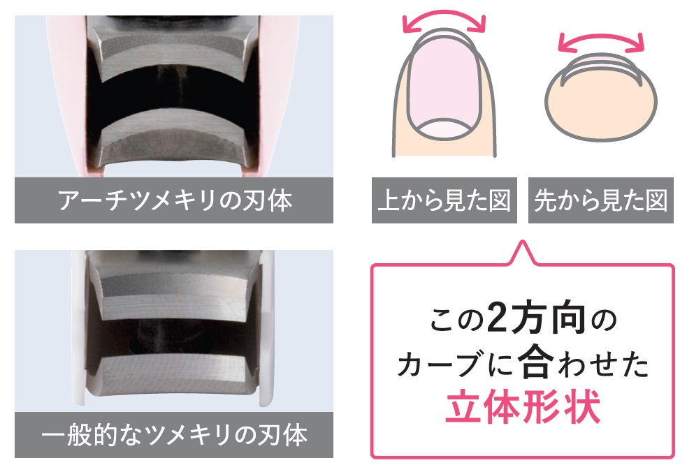 実際の爪の生え方と同じく刃先もタテヨコ両方にアーチを描いた形になっているので、割れやすい乾燥爪や薄い爪の人でも、カットする瞬間の自爪への衝撃を最小限にとどめつつ簡単に自爪ケアができます。