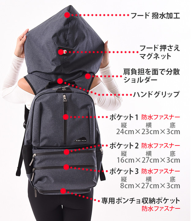 ブランド名の「EGSIACA(エグシアカ)」は、傘を作って身を守るクロサギのことで、 “自らの身をバックパックが守る” という新しい発想から考えられた防水バックパック。小雨であれば本体に取り付けられた撥水素材のフードをさっと被って素早く対応。底部には専用ポンチョが収納できるポケットが装備されているので、バックパックごと全身をポンチョで覆えば大雨でも大丈夫。激しい雨でもしっかり身を守ってくれる厚手素材を使用しているので、荷物も自分も濡れずに、通常通り目的地へたどり着くことができます。