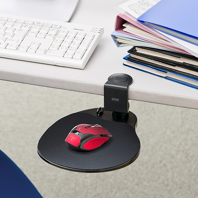 サンワサプライから登場したマウステーブル「200-MPD021シリーズ」(1380円)。デスクの天板に取り付けることで、マウス用のスペースを追加することができます。これなら資料の山をかきわけてマウスを使うこともなくなるので、仕事がはかどること間違いなし!