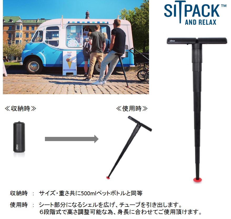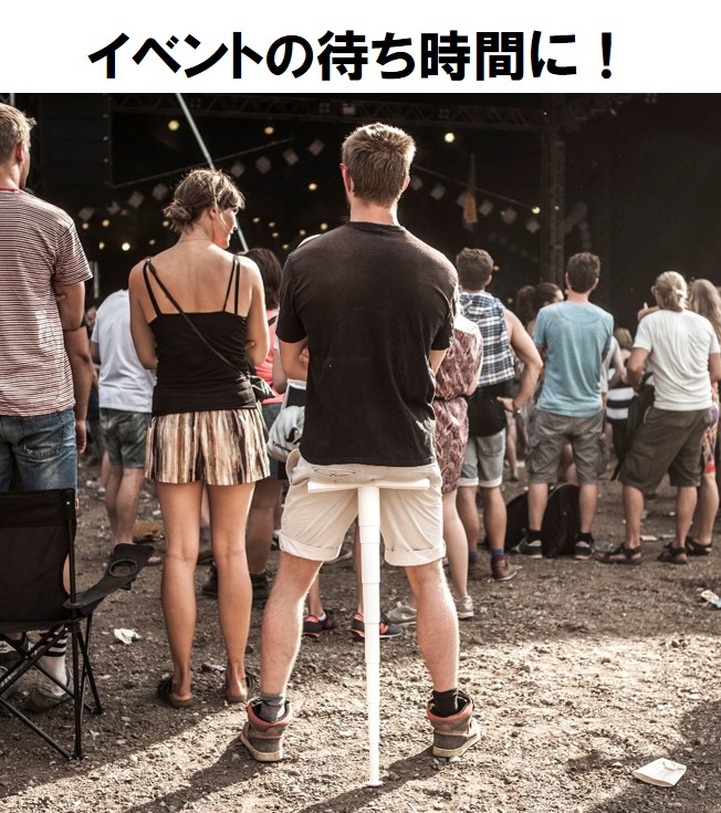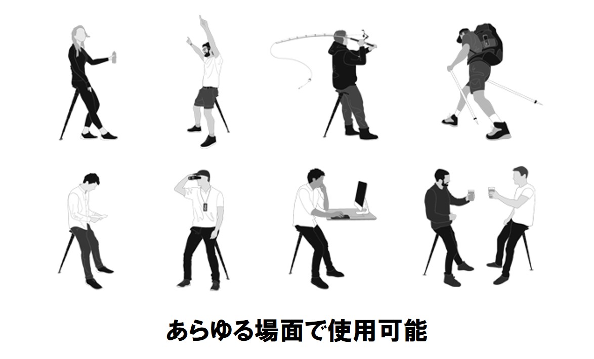 アウトドアなら山道など狭い場所や砂利道でも場所を取らずに小休止できるし、釣りやバードウォッチングなど同じ姿勢を保ちたいときにも便利。オールスタンディングのフェスやライブにスポーツ観戦、イベントの開場待ちの長い行列でも疲れ知らずです。流行中の立ち食いスタイルの飲食店、スタンディングスタイルのオフィスなど、日常使いでも活用できそう。