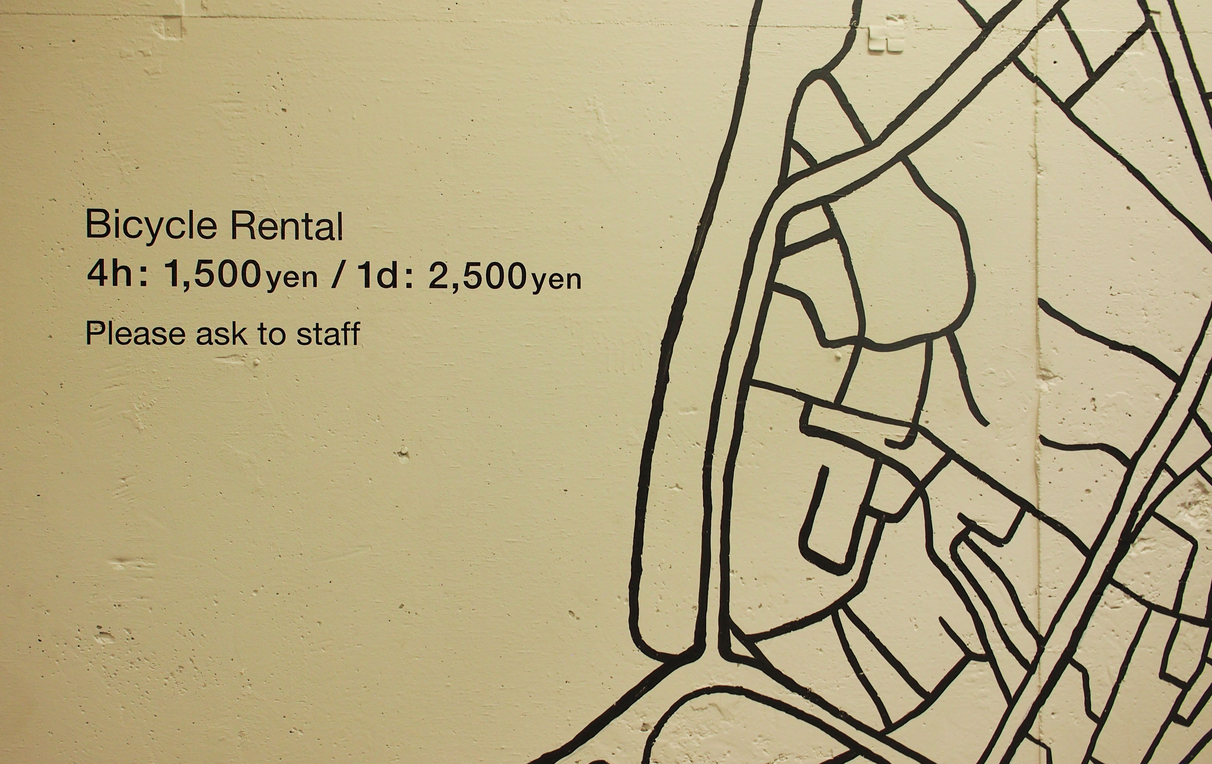 ▲周辺地図が描かれたウォールの前には、レンタサイクル用の自転車が6台並ぶ