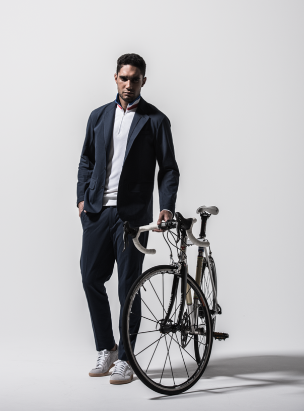 今回発売となった「サイクルテーラードジャケット」&「サイクルパンツ」は、自転車通勤の格好のままデスクまで向かえる、ビジネスシーン向けの商品です。デザインはコーディネートしやすいシンプルなものながら、自転車に乗りやすい機能が満載。