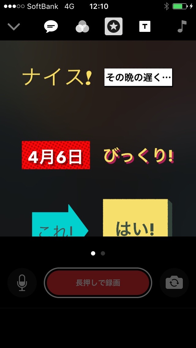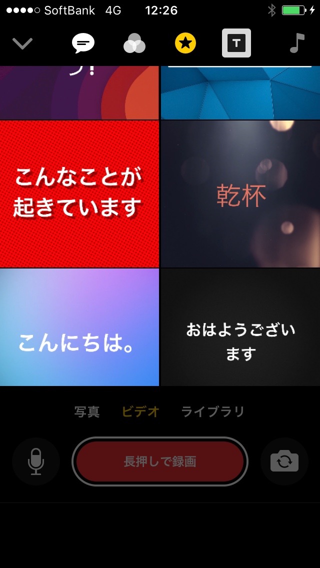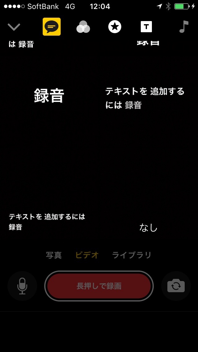 最初のカットでは、動画を撮りながら、話した言葉が画面に表示される機能を使用しました。アプリを開いたら、左上の吹き出しマークを選択し、文字のレイアウトを選びます。あとは、画面下部の “長押しで録画” ボタンを押しながら話すだけで、アプリが聞き取った文字が表示されます。