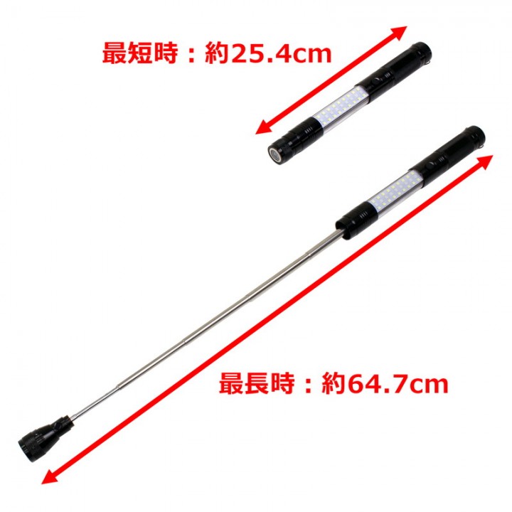 側面は明るい27灯のLED、柄の底面はフックと強力マグネットが付いているので、しっかり固定でき、ハンズフリーの作業もOK。