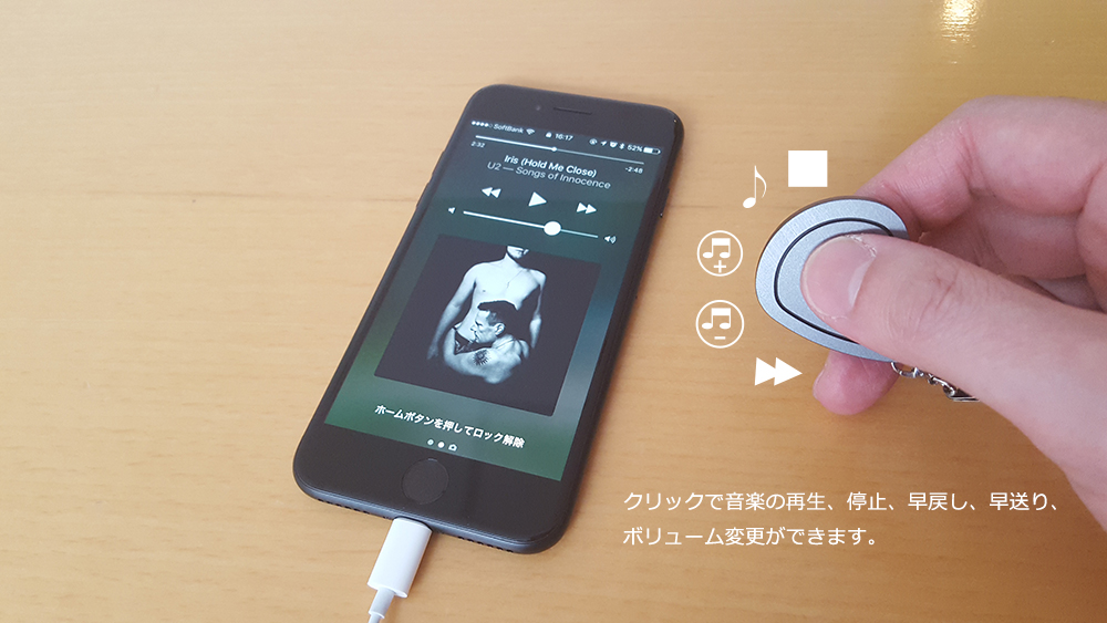 例えば、音楽再生。前もってミュージックアプリを選択しておけば、ボタン一つで再生・停止・巻き戻し・早送り・ボリュームの調整が可能です。