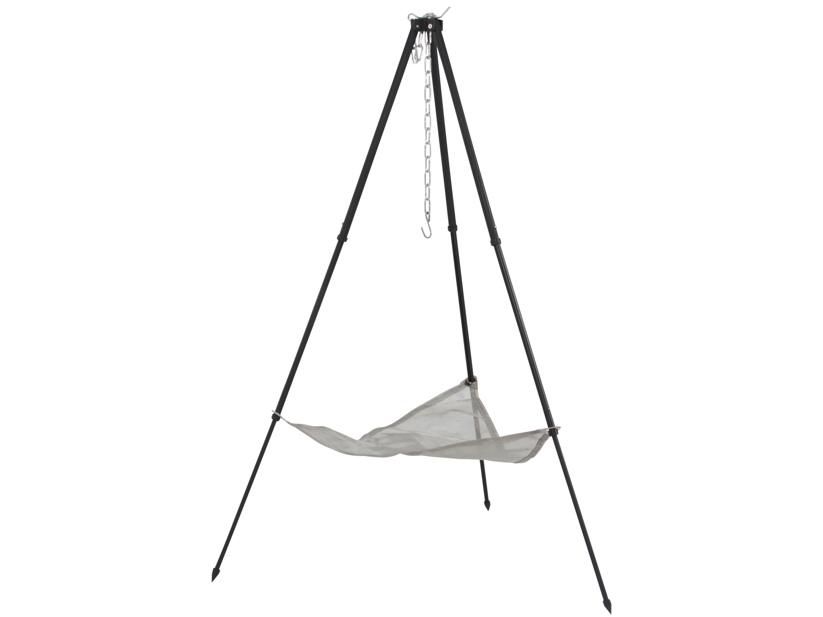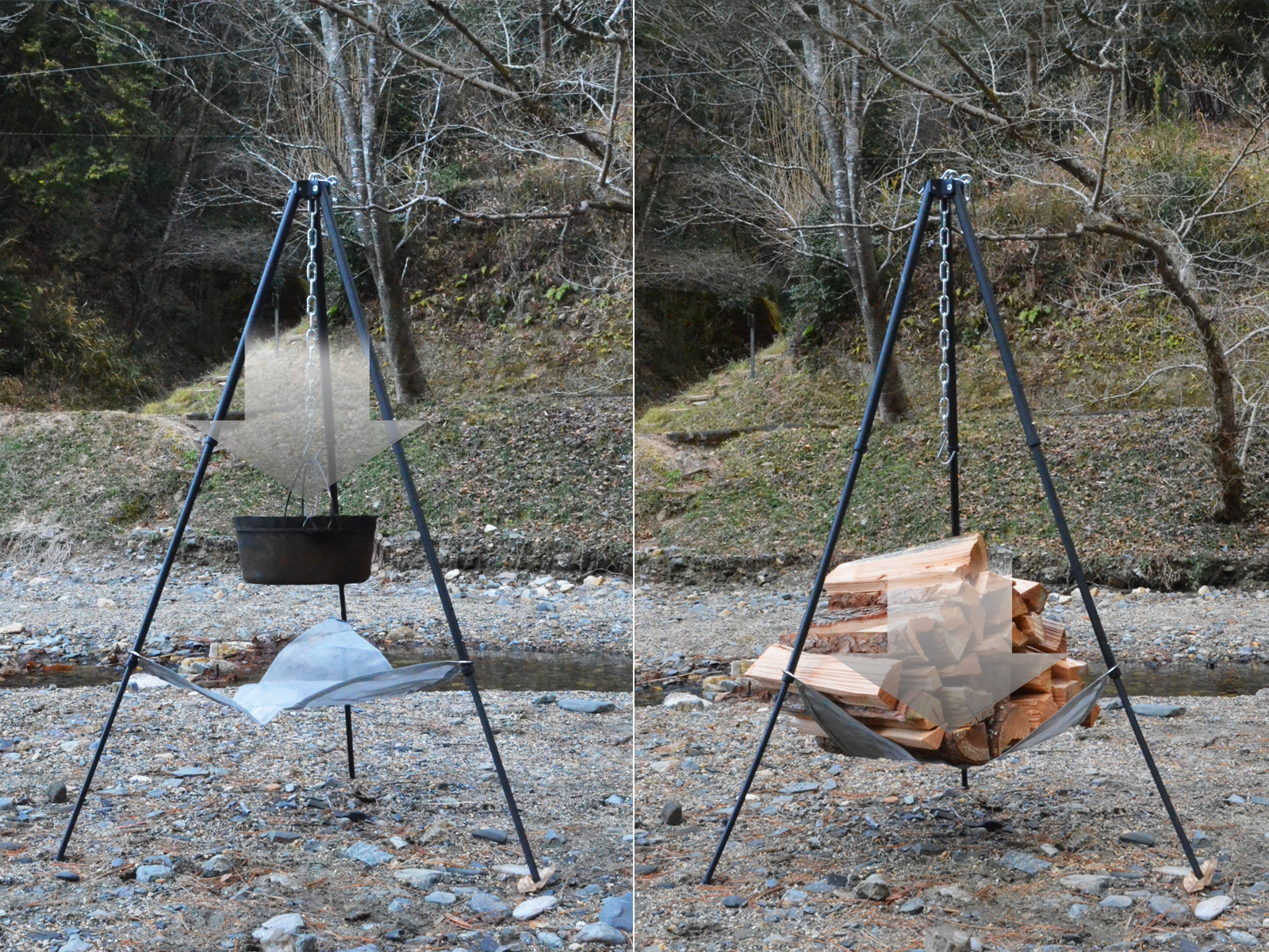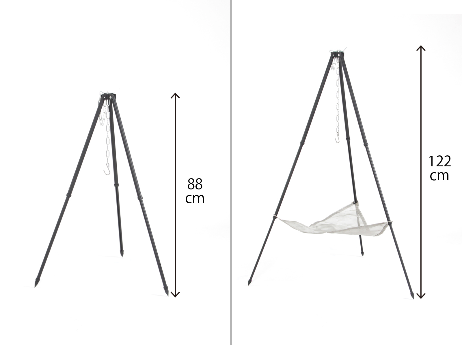 さらに結節部からダッチオーブンや鍋などを吊るせば、そのまま調理仕様に。トライポッドの高さは88センチと122センチの2段階設定で、鍋を吊るすフックチェーンも長さ調整ができるので、鍋のサイズや火力に合わせてちょうどよい高さにセットできます。