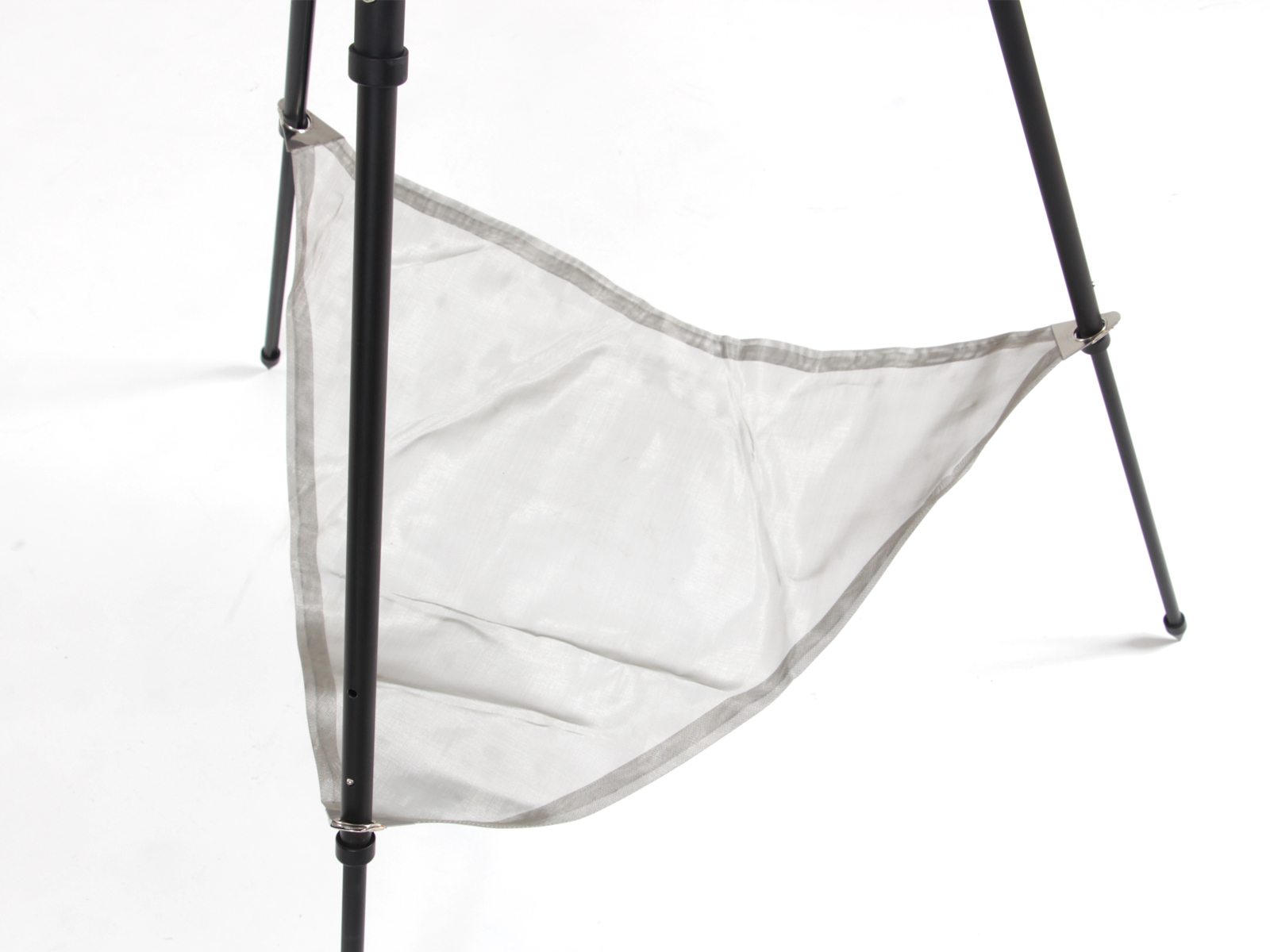 重い鍋を吊るすとなると強度が気になるところですが、ポールには強さと軽さを併せ持つアルミ合金を採用。硬質アルマイト加工を施し、耐火性、耐摩耗性も十分。しかも静止耐荷重はトライポッドが20㎏、メッシュが5㎏もあるのに、本体の重さはわずか1.3㎏。トライポッドの先端を保護するキャップと、キャリーバッグも付属しているので、できるだけ荷物を軽く、まとめて運びたいキャンパーにはうってつけです。