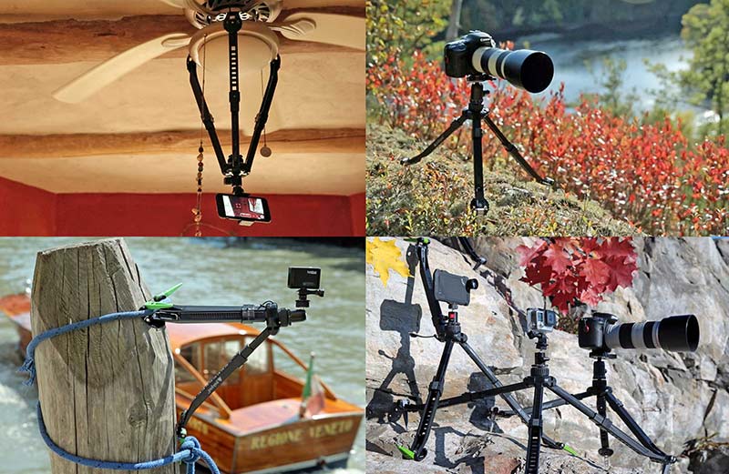 脚部の長さや角度は各脚ごとに調整することができるので、設置場所に応じて独創的な方法での三脚固定もOKです。