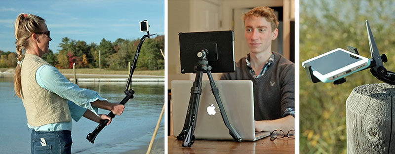 スマホやモバイル端末、コンパクトデジカメ、一眼レフなど、取り付けたい機材に合わせて変更ができるカメラマウントキット(計4種類)もあります。