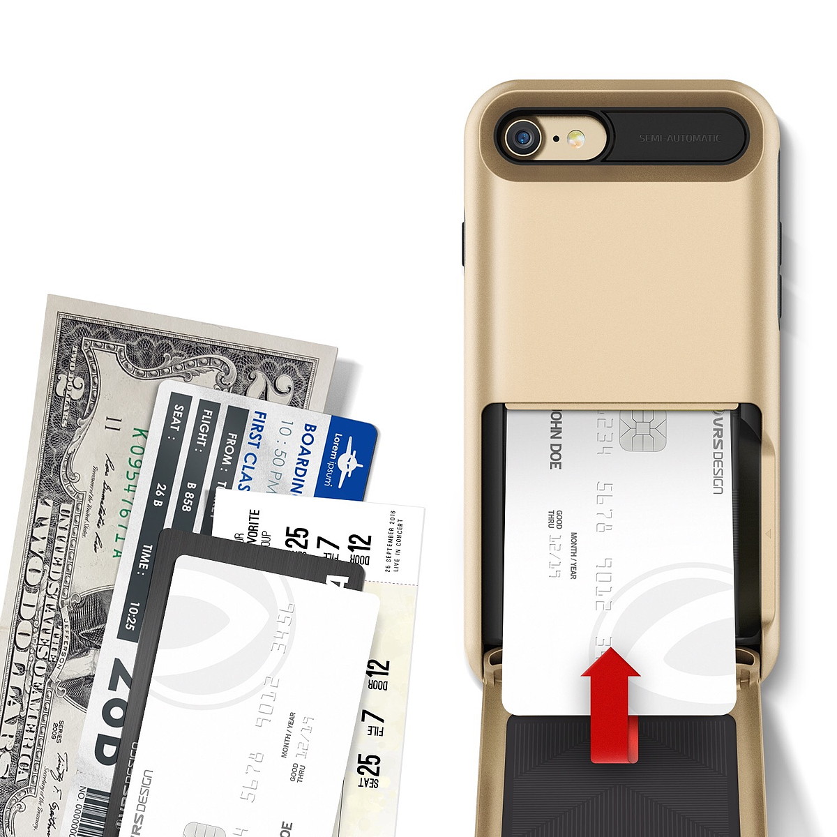 ケース背面部にカードホルダーが備わっていて、クレジットカードなどの厚みがあるカードで最大5枚、名刺なら約10枚、紙幣なども収納できます。旅行先やコンビニでの買い物時などでは、本ケースを装着したiPhone 7があればOK(電子マネーなどのICカード類はホルダーから出して利用)。