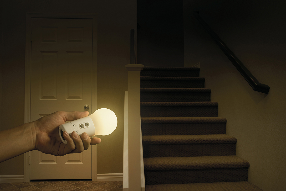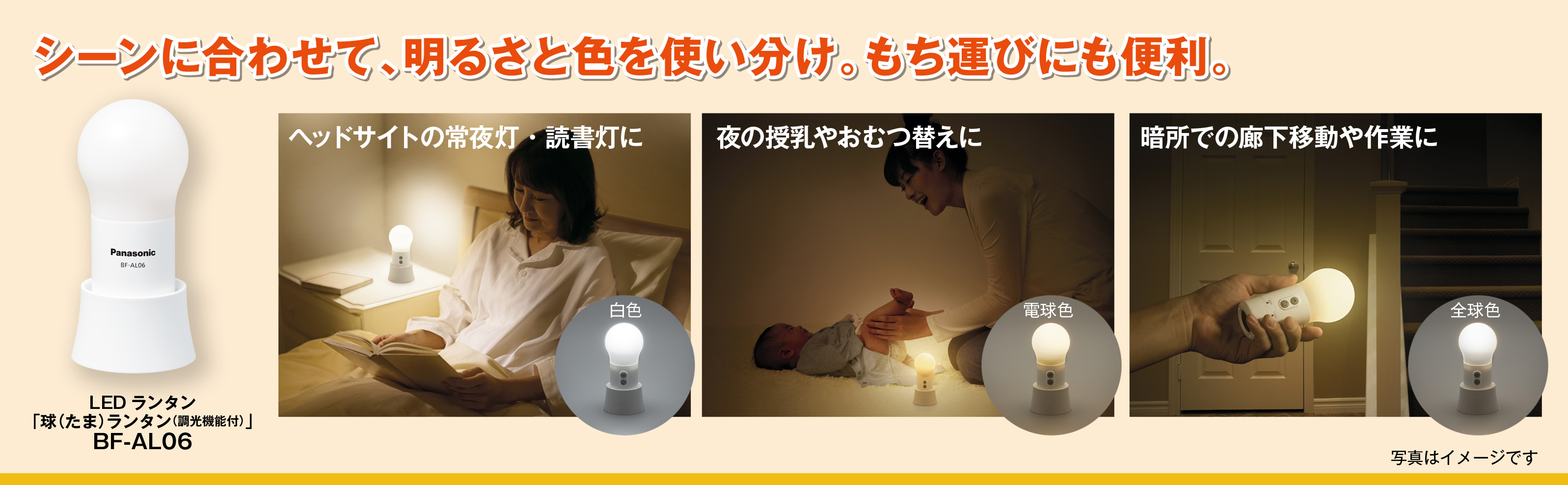 単三型乾電池3本を使用するポータブル仕様で、従来品の約2倍となる約2000時間(約80日間)の長時間連続使用もOK(付属の乾電池エボルタ+白色/電球色・明るさ1の場合)。枕元灯やインテリアライトだけでなく、ひもを利用して本体を釣り下げて使ったり、懐中電灯として使用することもできます。最大100ルーメンの明るさながら低電力のLED光源で本体や発光部が熱を帯びないため、小さな子どもがいる家庭でも安心して使えます。