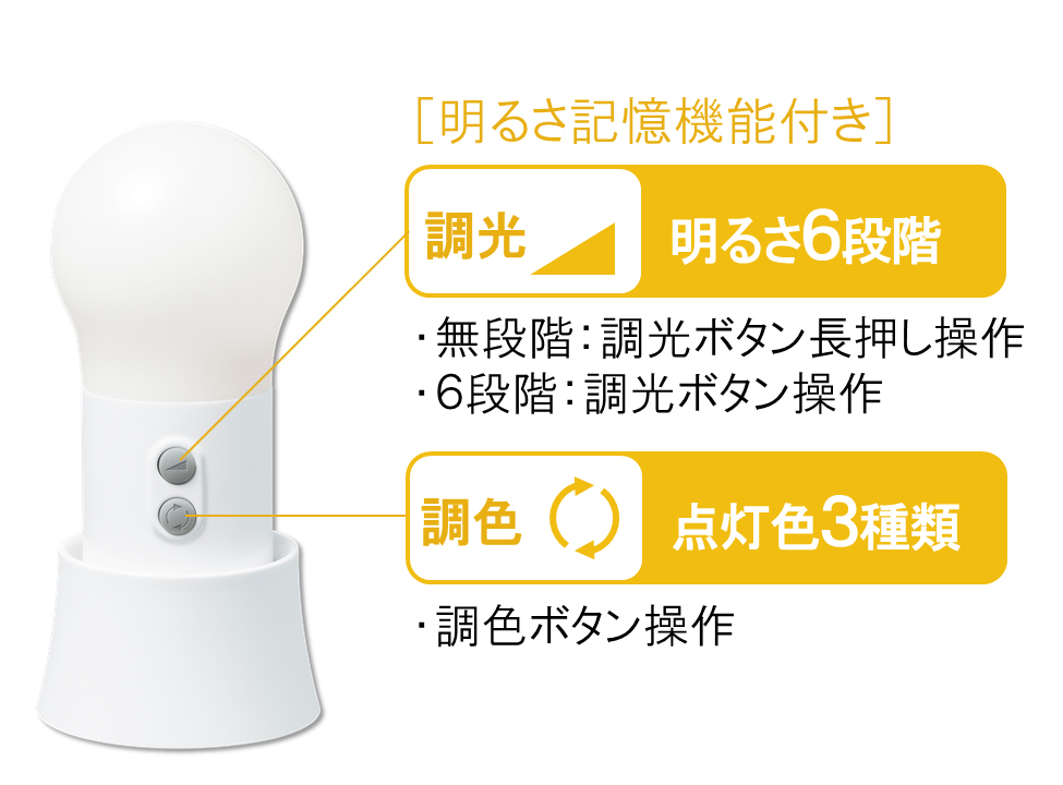 好評の球状シルエットと優しい明るさはそのままに、6段階の明るさ調整機能と3種類の点灯色調整機能を搭載。それぞれボタンで簡単に調整ができ、使用シーンにマッチした計18通りのあかり調整が可能です。
