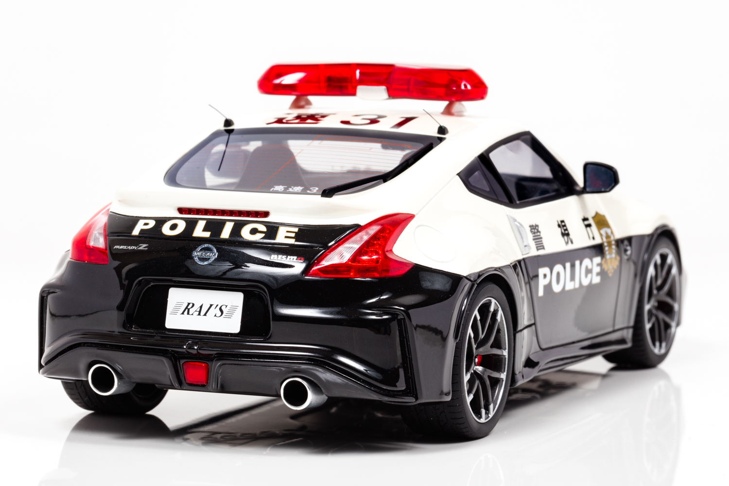 ドアの開閉機構などはありませんが、このニスモZ専用の19センチホイールや、車体左右のPOLICEロゴ、ブーメラン型のパトライトなど、警察車両としてのディテールを可能な限り再現。運用されている3台のうち、高速隊に配備された車両を再現しており、後天井のユーロアンテナが左右1本ずつあるのがポイント。