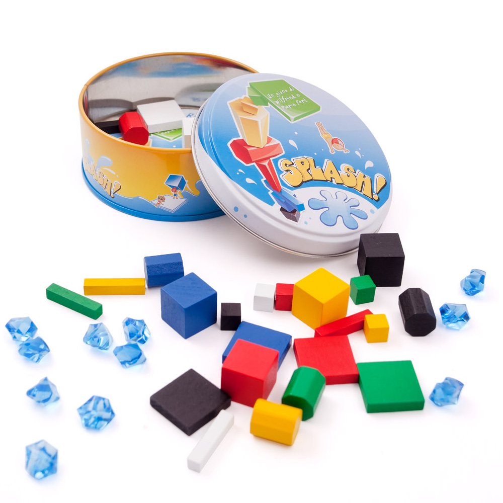 崩れた塔が水に落ちた! ということから、崩した人にブロックを渡したプレイヤーに得点が入ります。得点は水しぶきをイメージしたコマ。先に3点獲得するか、手持ちのブロックがなくなったプレイヤーが勝者となります。ゲームに必要なブロックと水しぶきのコマをまとめてしまえるブリキの缶もついているので、お片付けや持ち運びにも便利です。