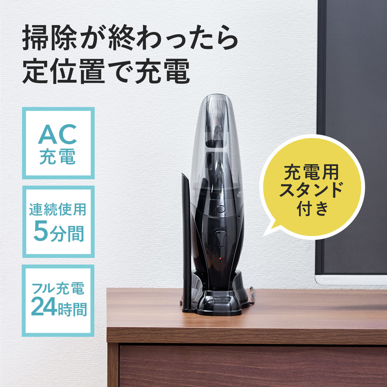 充電式のコードレスタイプで、付属の専用充電スタンドで自立するのも使いやすい。充電時間は20時間、連続使用時間は5分間とやや短いので、使わない時はスタンドを定位置として充電しておくという使い方がよさそうです。