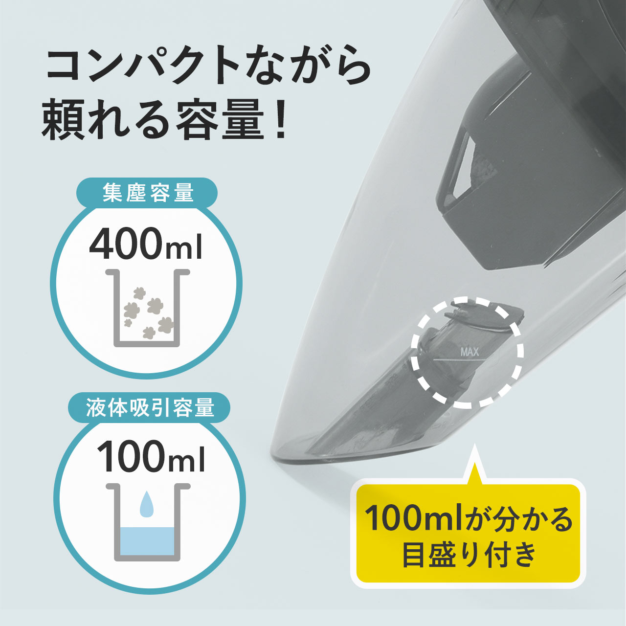 使い続けてもパワーが衰えないサイクロン方式採用で、普通のゴミなら400ml、液体なら100mlまで吸引できる余裕の集塵容量。