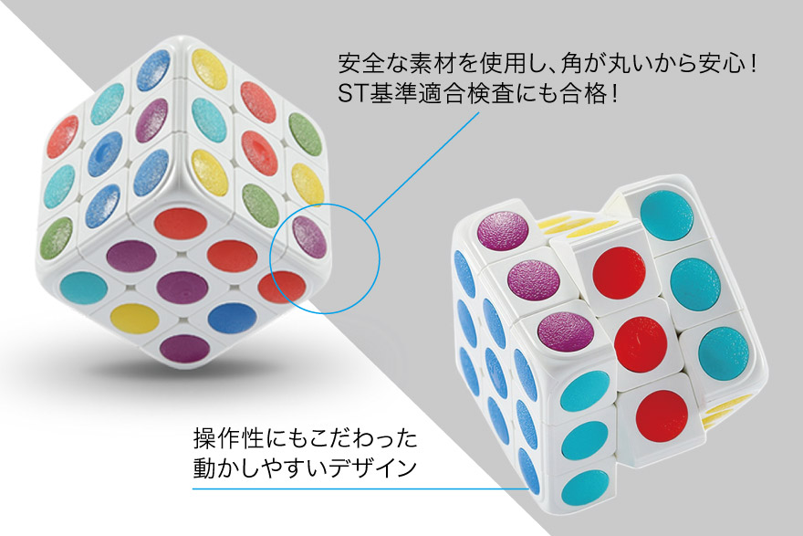 操作性にもこだわったデザインで、子供の手でも動作はスムーズ! 従来のキューブパズルよりも角が丸くなっているので、ケガをする危険が少ないのも、子供にも持たせる玩具として安心だ。