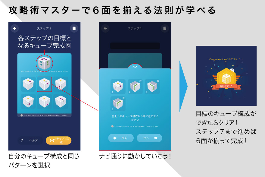 ナビを始めるとき、キューブはどんな状態でもOK! いつでも好きな時にナビを開始でき、一時停止や、1手順戻ったり進んだりすることも可能と、どこまでも親切なのだ。さらには「攻略術マスター」モードなら、7段階のステップを経て、少しずつ6面を揃える法則が学べる。自分の力でパズルを解く力を身に付けることができるぞ!