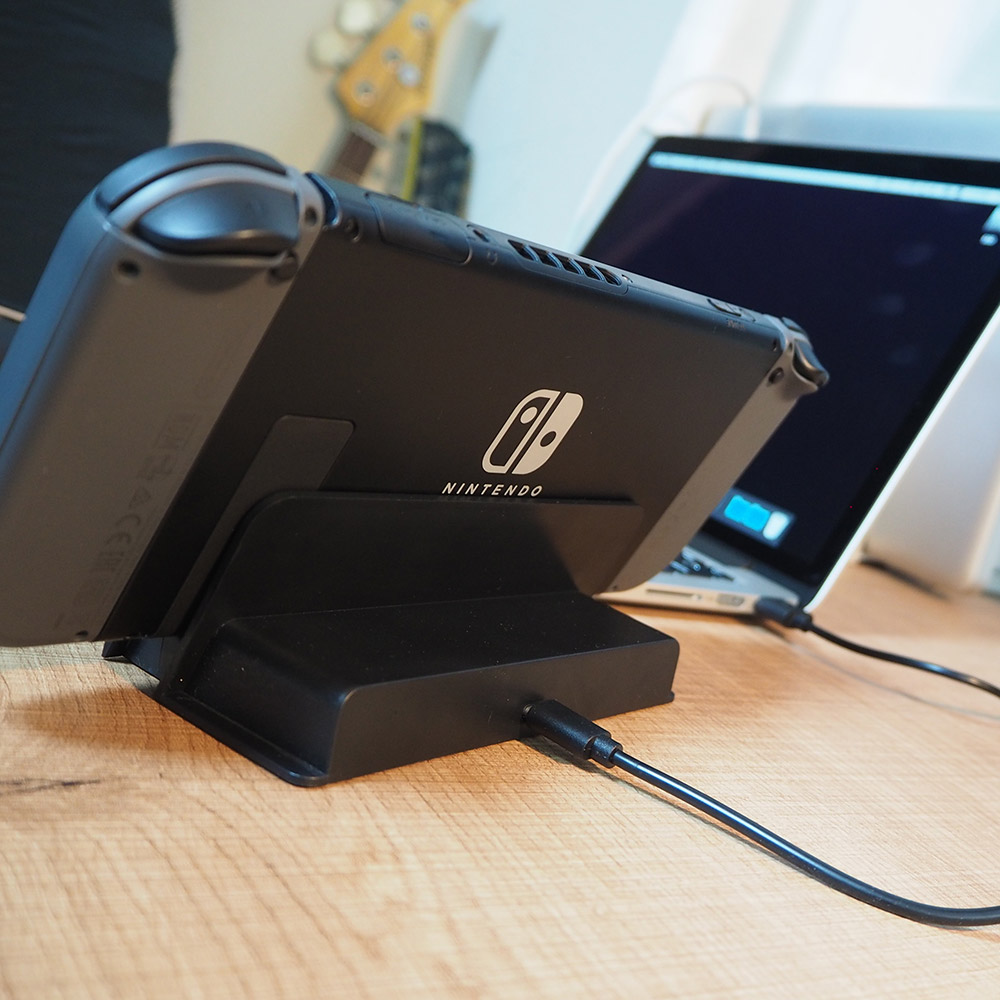 しかし、この充電用スタンドがあれば、Switch本体をスタンドに置くだけで充電しながら遊べます。Nintendo Switchに付属の純正ACアダプターを使用すれば、ドックで充電するのと同じ3時間でフル充電できます。また付属の充電ケーブルはUSB-C to USB-Aケーブルなので、パソコンやモバイルバッテリーからも充電が可能。外で遊ぶ時にも便利です。サイズは約140×67×49mm、重さ約55gとラクラク持ち運びできるサイズになっています。