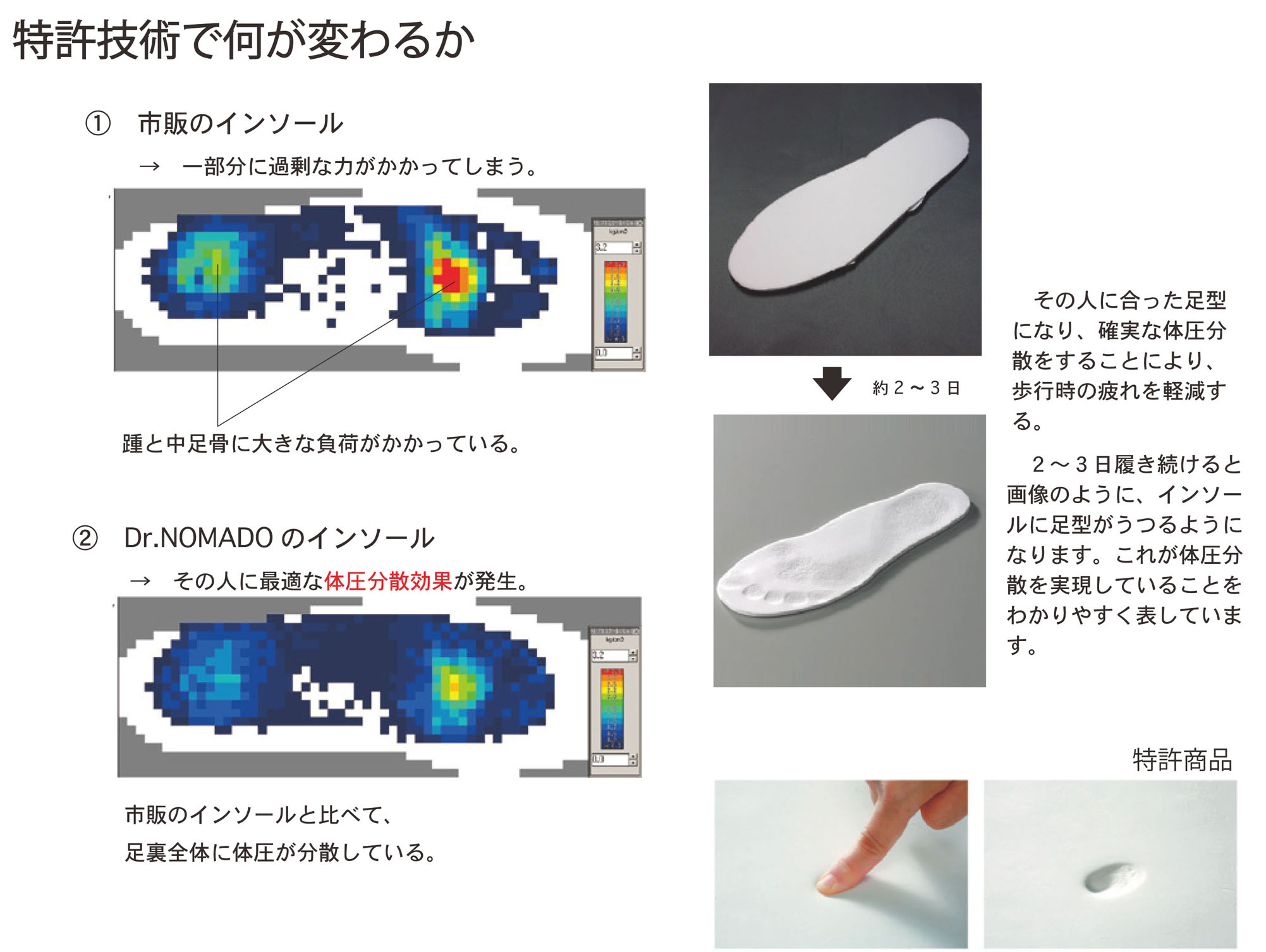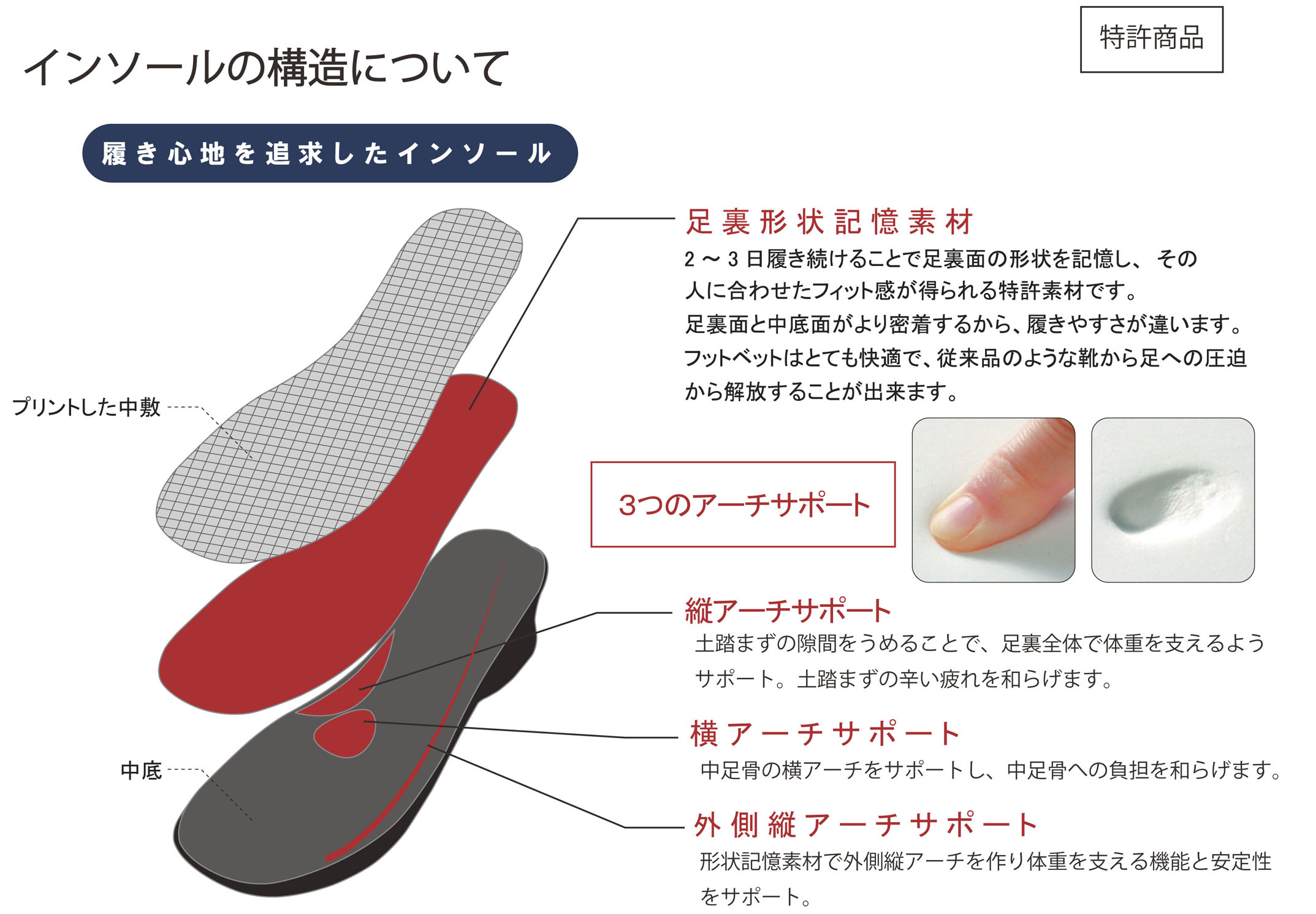 ポイントは、インソールに採用した特許素材。2~3日履き続けることで足裏面の形状を記憶し、その人の足型がうつります。これにより、足裏の一部分に過剰な力がかかることなく、足裏全体に体圧を分散させることが可能となるのです。