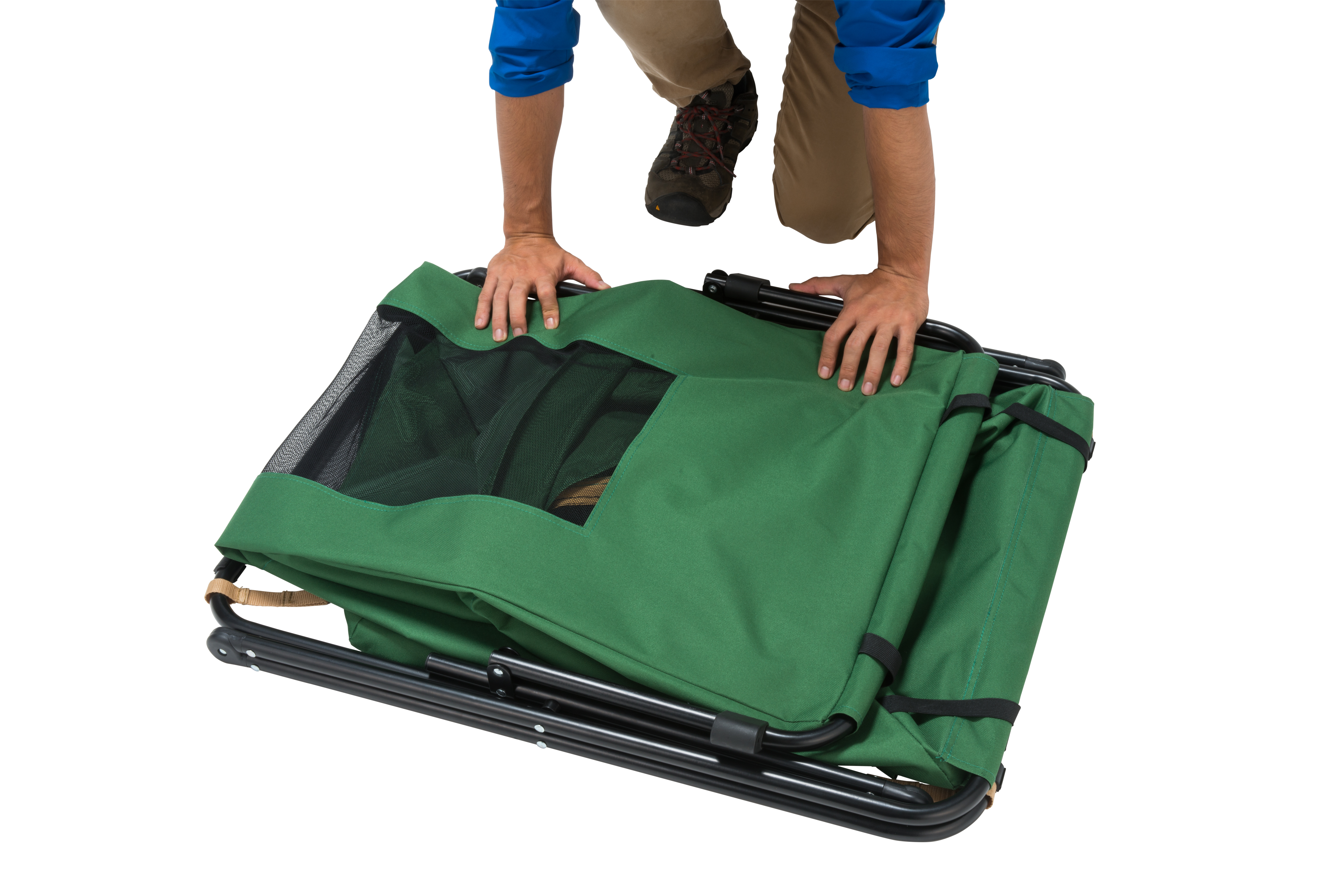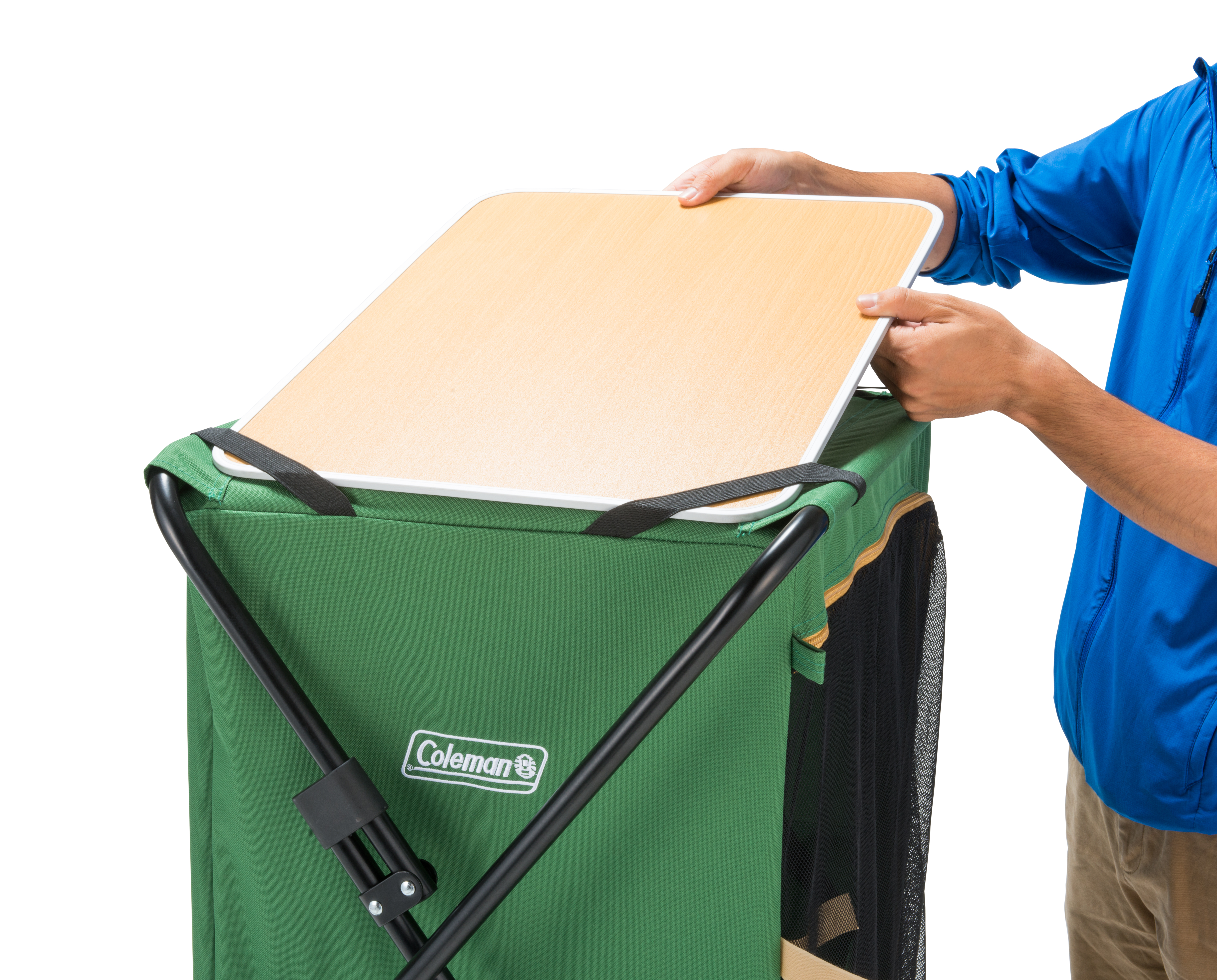 自宅で収納していたグッズと共にキャンプ場に持っていけば、食材や食器類など、地面に置きたくないグッズを自分の手が届きやすい高さに置いておける。また、棚の前面はファスナーで開閉できるメッシュ素材になっているので、通気性を保ちつつ、虫よけにもなってくれます。