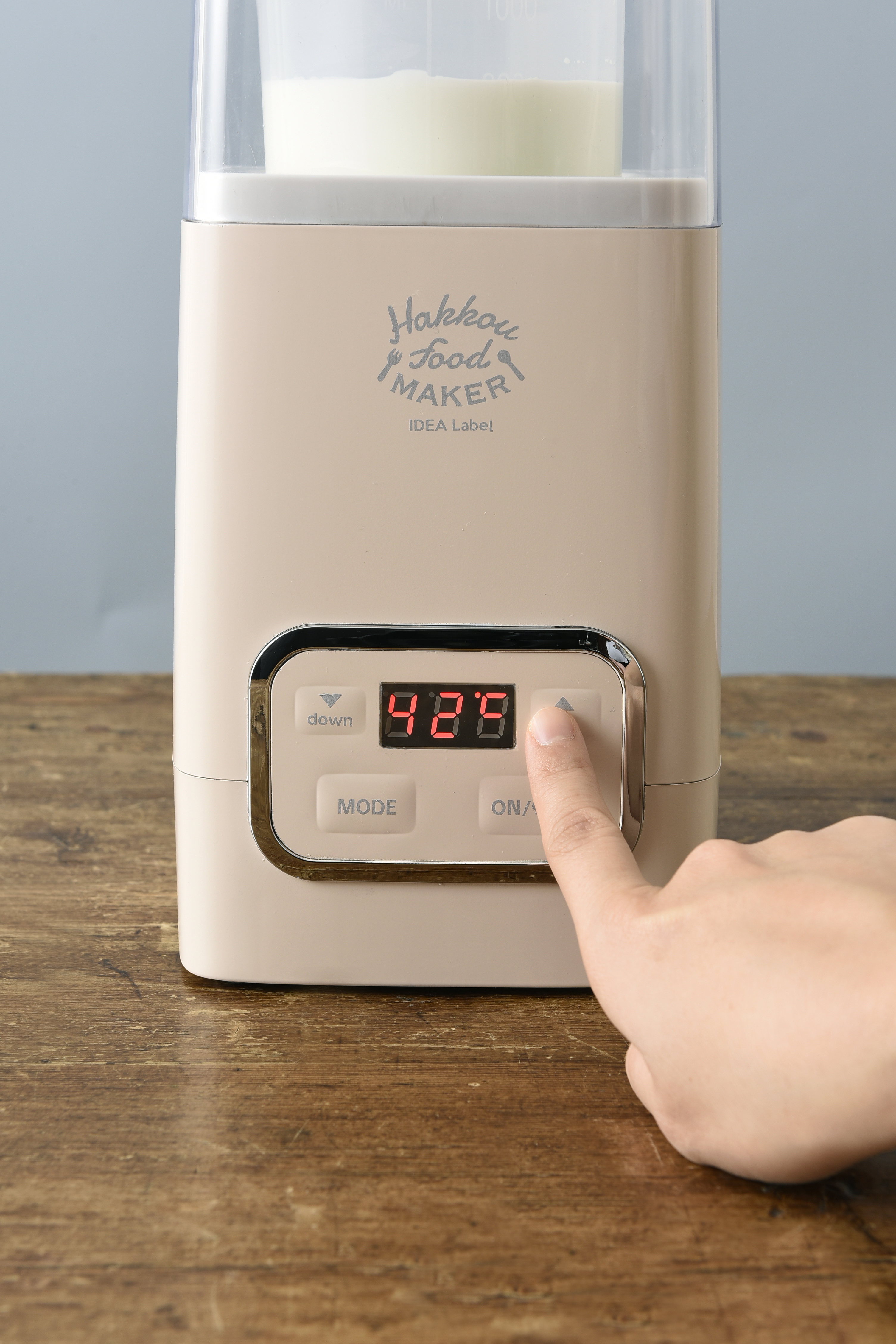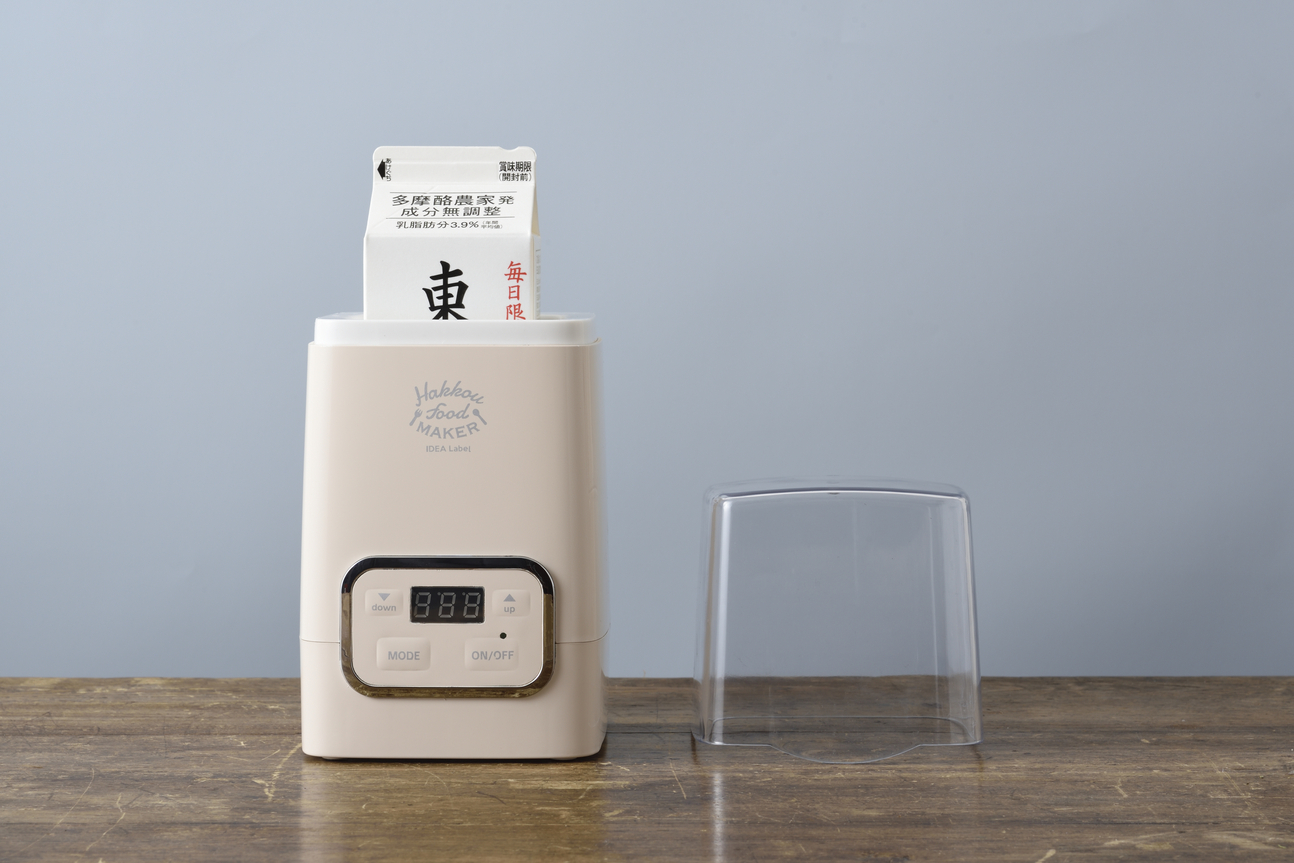 W130×H281×D138(mm)という縦長サイズの「発酵フードメーカー」。2つ付属している専用容器に食材を入れて混ぜ、本体にセットして温度とタイマーを設定すれば、あとは放っておくだけで、甘酒やチーズ、塩麹などの発酵フードが完成します。また、本体には500ml~1Lの牛乳パックがすっぽりと入るので、専用容器に移し替えることなく、市販の牛乳パックをそのまま利用することもできて手軽。