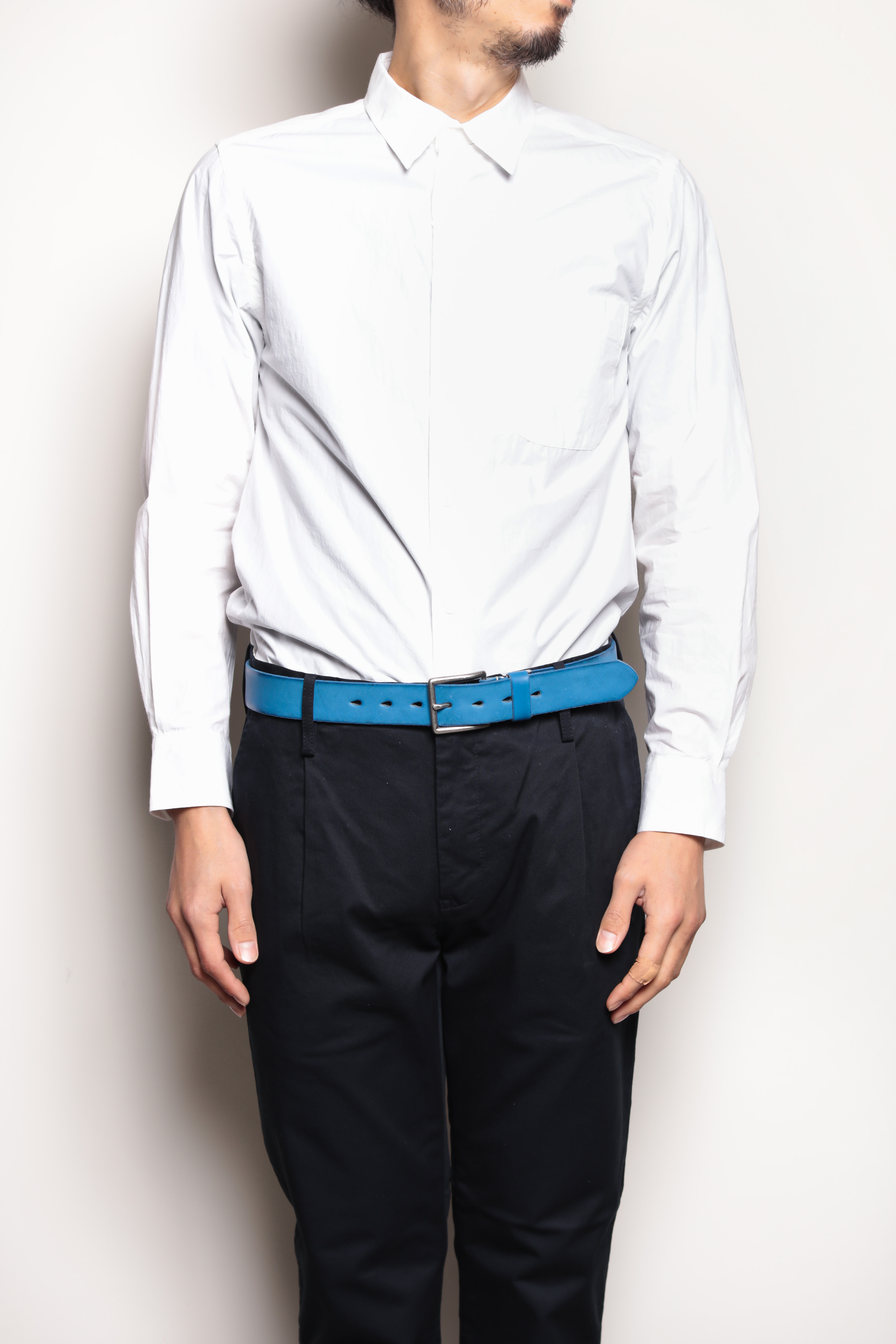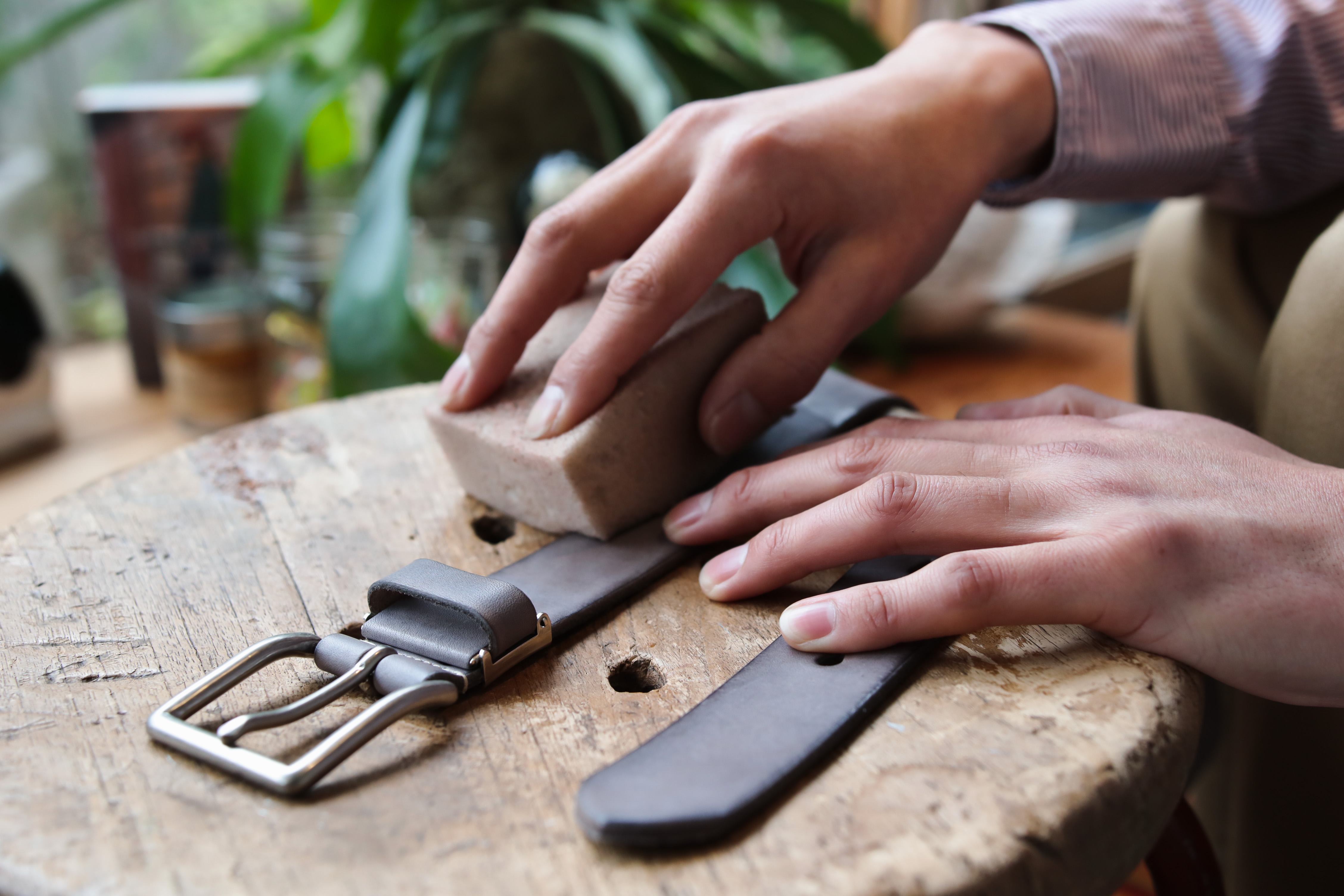 「エイト」は、35ミリ幅バックル仕様の本牛革ベルト。兵庫県姫路市のタンナーで鞣された上質なベジタブルレザーを使用し、すべての工程を国内で行っています。このベルトがユーザーの手に届いた時点ではまだ“未完成”。付属の革の質感をより良く見せる「ラナパーオイル」の浸透加工を自らの手で行うことで完成品となるのです。