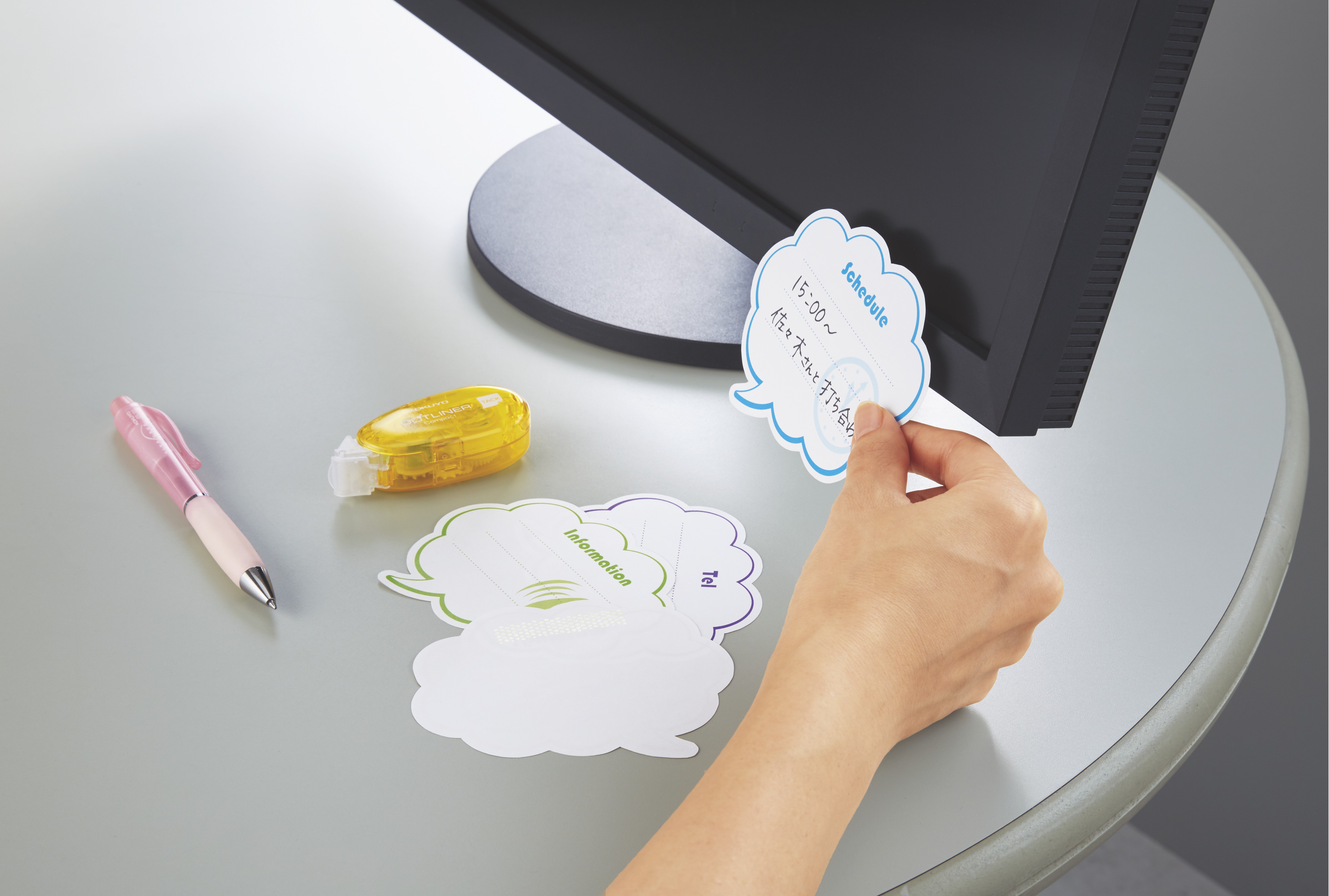 「貼ってはがせる」は、粘着度が弱めのテープのり。普通のメモを付箋のように使ったり、位置決めをする際の仮止めとして使ったりすることもできます。デスク周りだけでなくリビングやキッチンにあれば、食材や調味料、お菓子など袋物の口を閉じておくときに重宝しそうです。