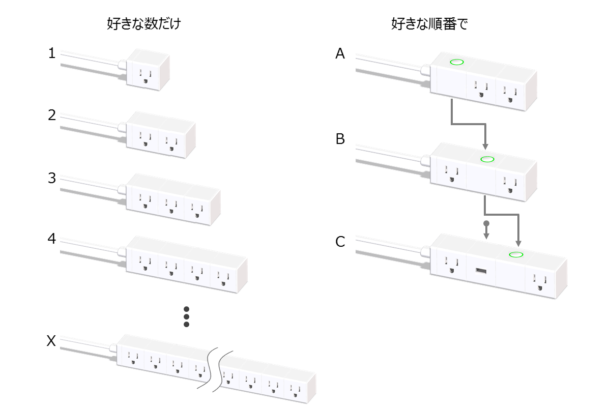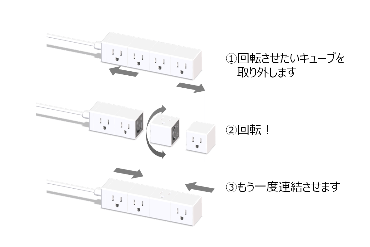 また、必要な分だけキューブを足せるので、会議の際に参加者のノートPCの数だけ連結したり、家電のレイアウトに合わせてキューブを増減したり、なんてこともできますよ。
