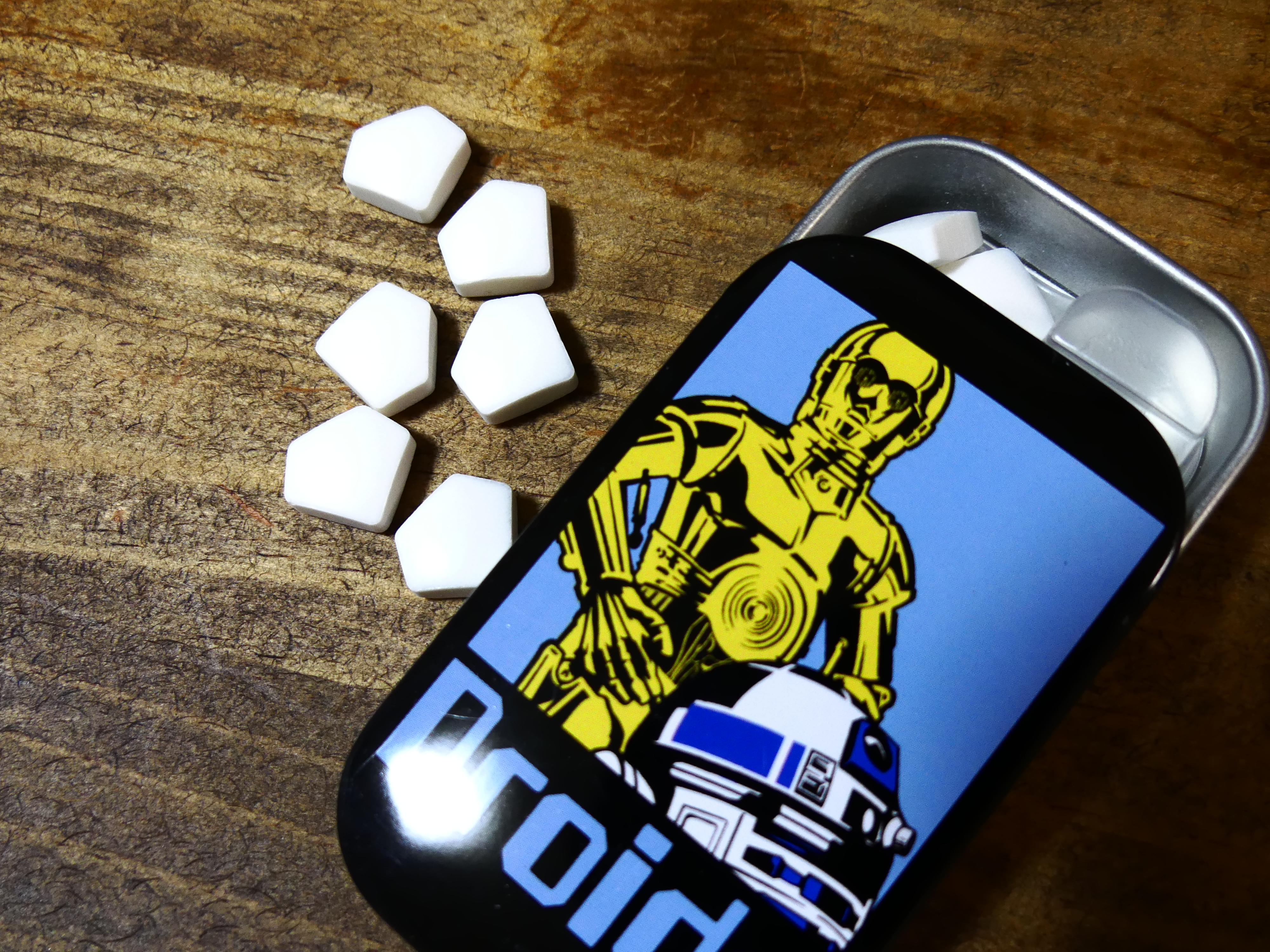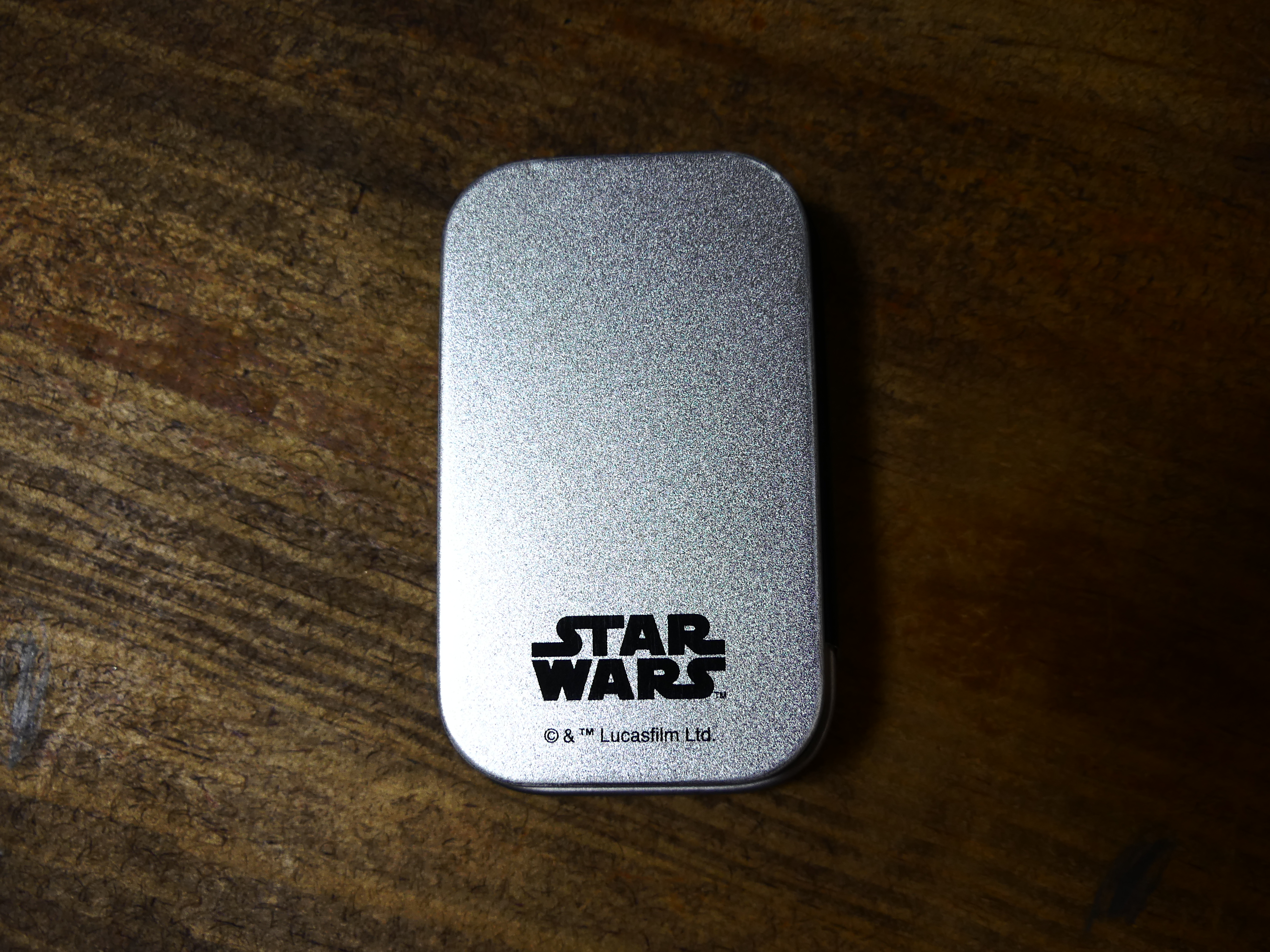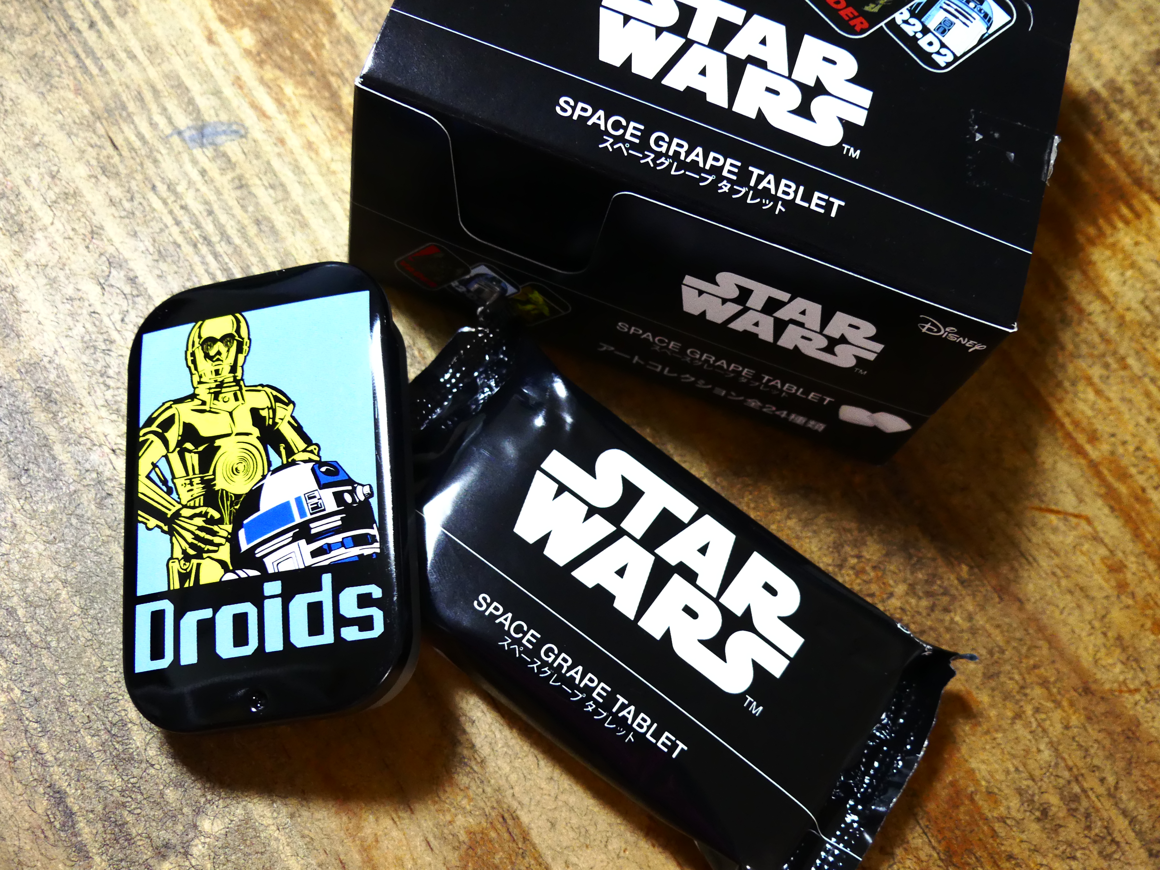 スター・ウォーズの「スペースグレープタブレット」は、全24種類。どれが出るかは開けてのお楽しみになっています。単品価格は324円、6個入りBOX価格が1944 円となります。とりあえず、ひとつ開けてみたところR2-D2とC-3POのコンビ缶が! これって本命に近い?(笑)。