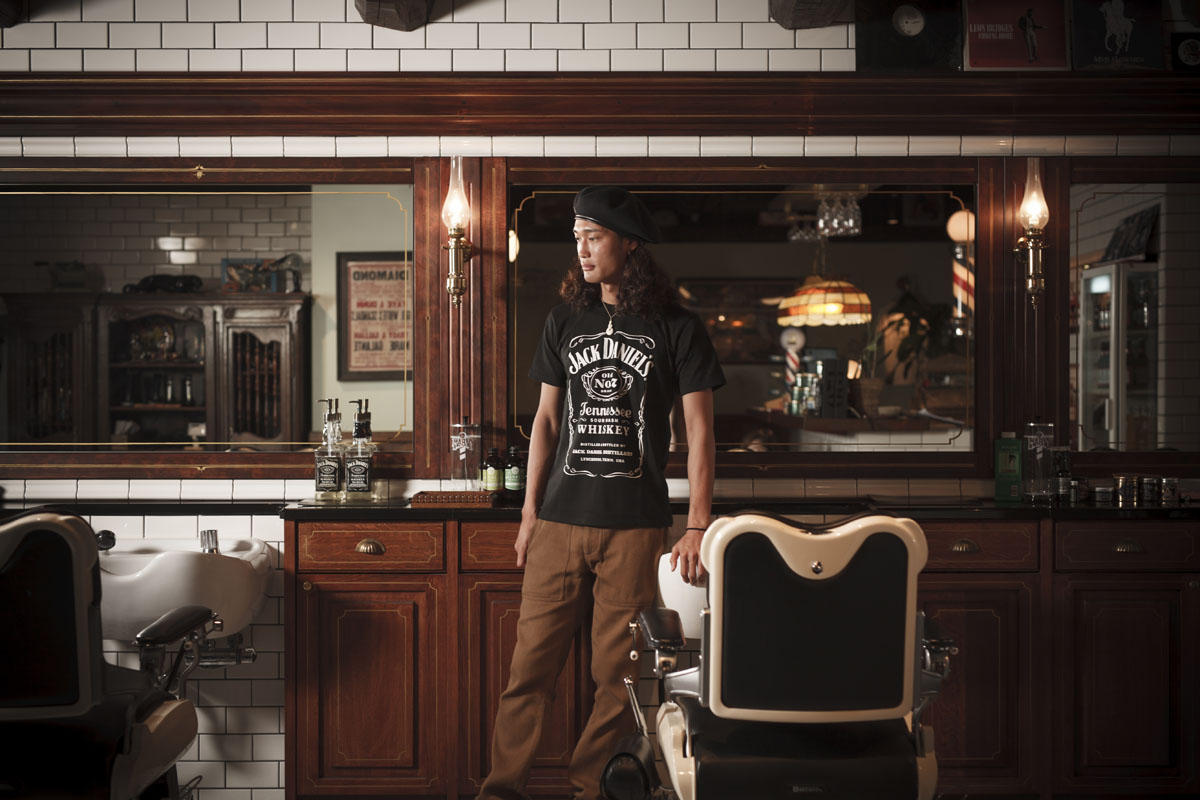 ▲歴史と普遍性があるラベルだからこそTシャツのデザインにしても様になる。モデルは東京・神田のバーバー「THE BARBA TOKYO」のスタッフ、鈴木鴻介さん。こだわりのインテリアとジャック ダニエルの世界観がぴったりとマッチする