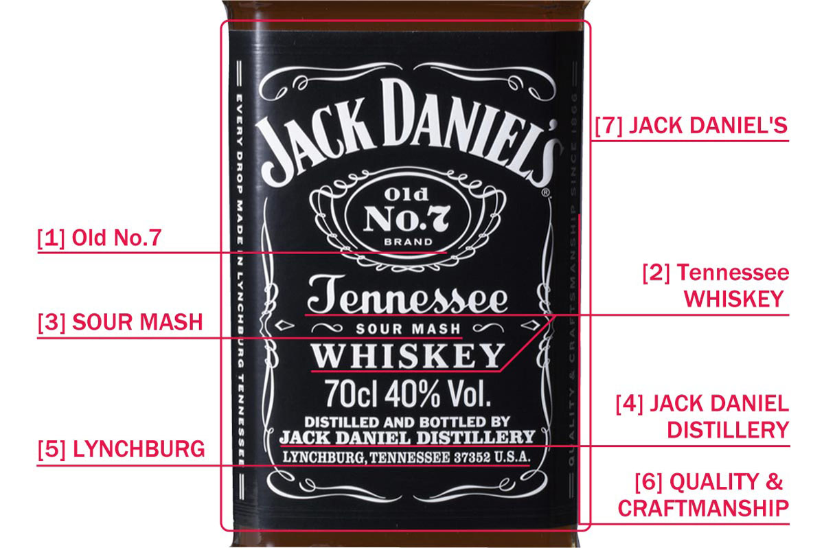 角型のボトルにブラックラベルというイメージは、「ジャック ダニエル」の最も代表的な銘柄である「ブラック(Old No.7)」によるもの。『JACK DANIEL'S』というロゴのすぐ下に、強調デザインをあしらったロゴマークのように『Old No.7』と記されているのは、それが昔ながらの正式な銘柄だからである。