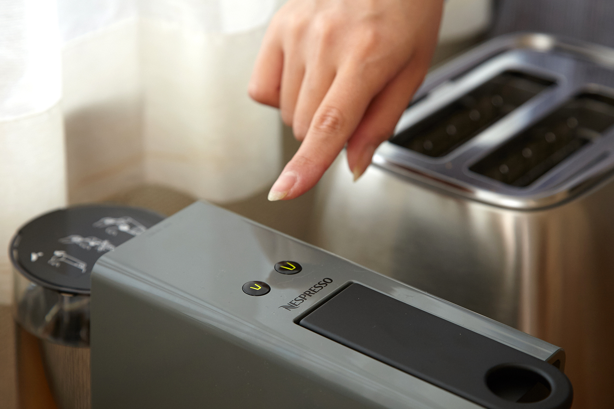 「エッセンサ ミニ」は、ちょっと狭いキッチンスペースやテーブルの上にも置けるコンパクトなサイズが特徴(幅8.4×奥行き33×高さ20.4cm ※Cタイプ)。ネスプレッソ史上最小で、重さはわずか約2.3kgと最軽量のモデルとなる。小さくても、最大19気圧の高圧力の抽出機能はそのままだから、こだわりを持って製造されたカプセルコーヒーそれぞれのアロマと深い味わいを、誰でもボタンひとつで簡単に引き出し、なめらかで上質なクレマを持つ一杯を作ることができる。