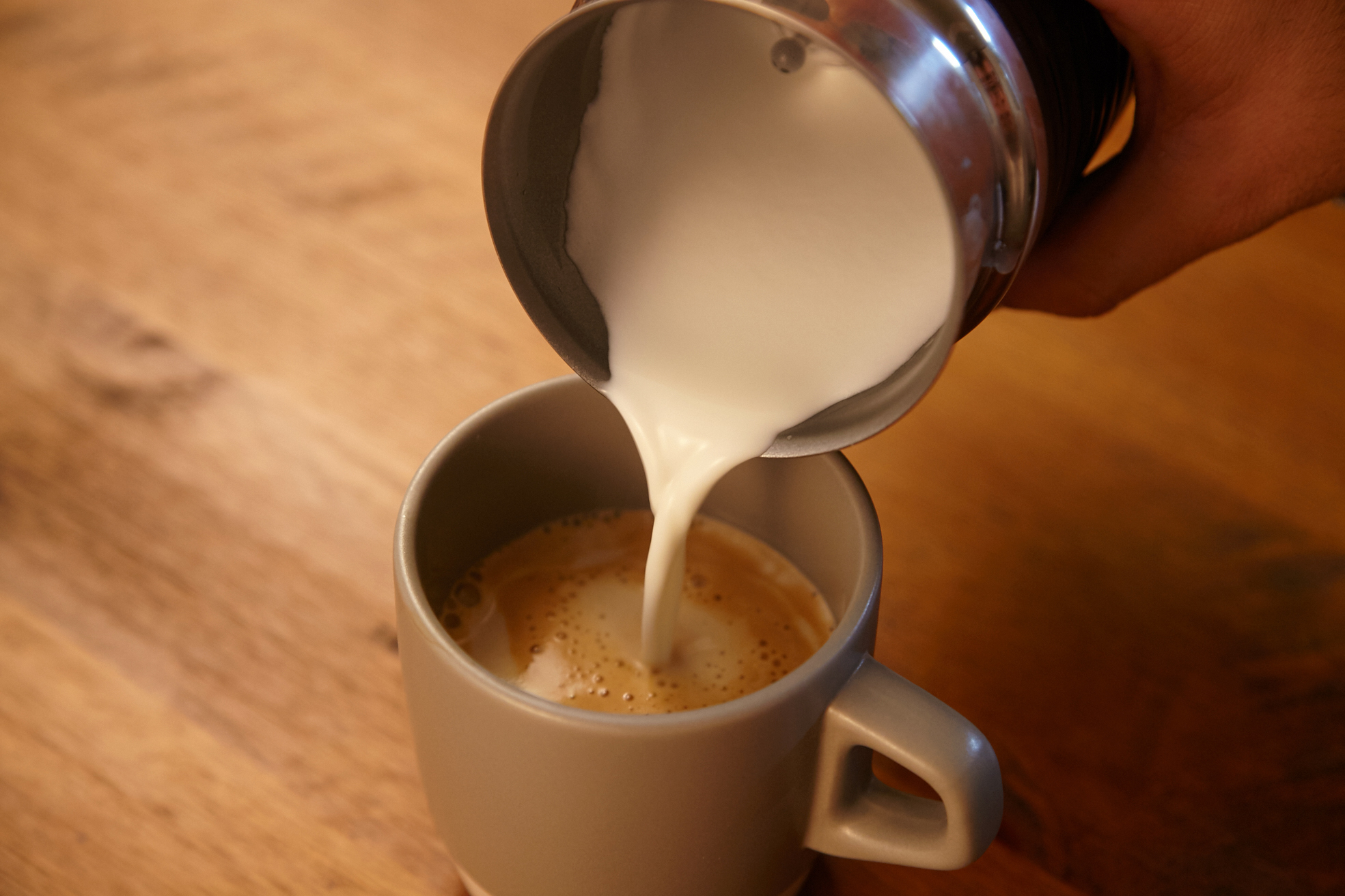 「エッセンサ ミニ」で作ったエスプレッソを入れたマグカップに、まずは温めたミルクを入れる。夜ということもあり、エスプレッソはカフェイン少なめに「ヴォリュート・デカフェ」を。