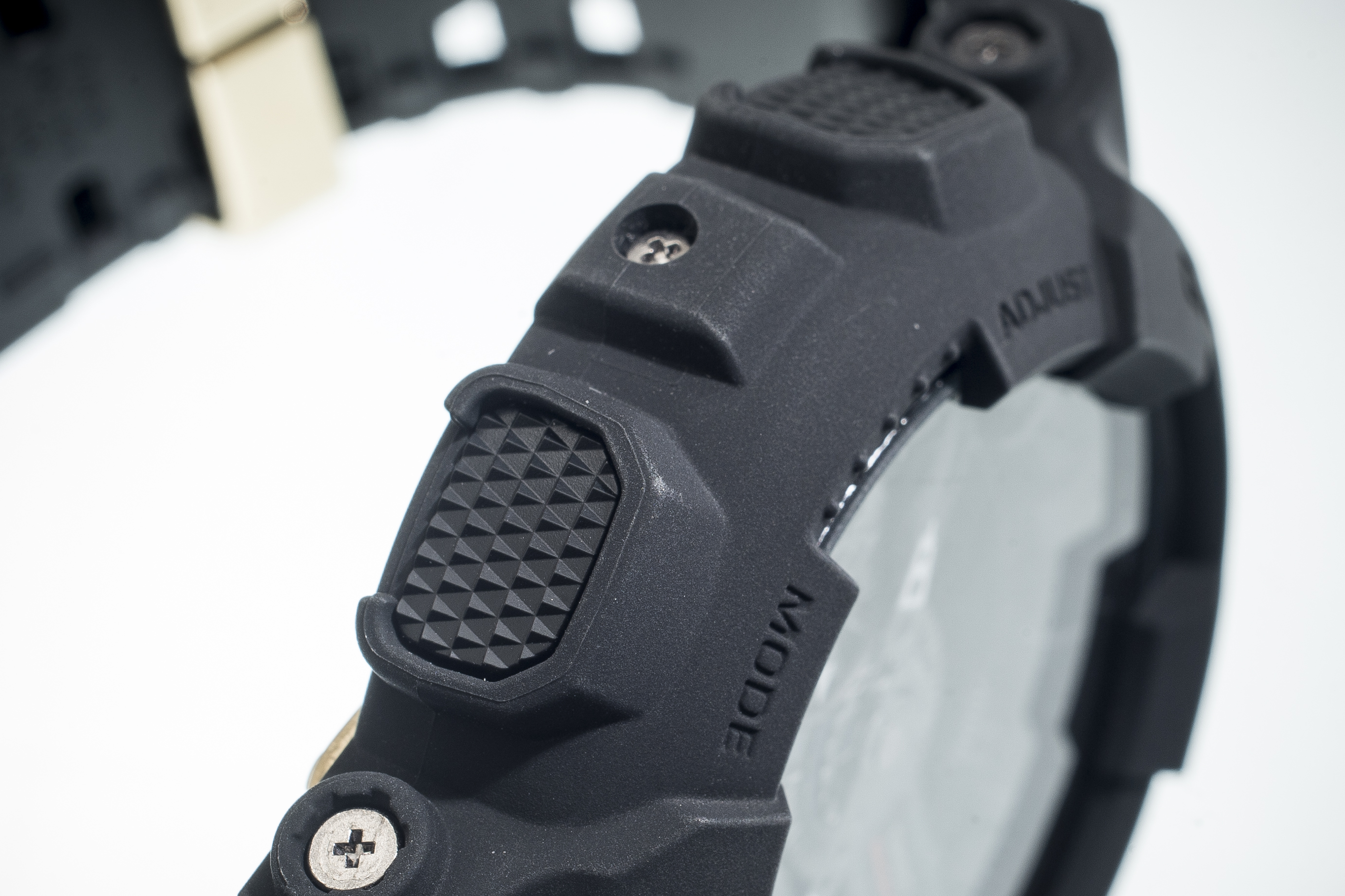 こちらは、さまざまなカラーリングで人気を博した「GA-700」がベース。先に紹介した「GA-135A-1AJR」に近い迫力あるケースだが、6時方向に配した大型フロントボタンによって、よりタフに、よりダイナミックなタフネスデザインを実現している。1/1000秒ストップウオッチや速度計測機能、JIS1種の耐磁性能など実用的な機能も豊富に搭載されている。