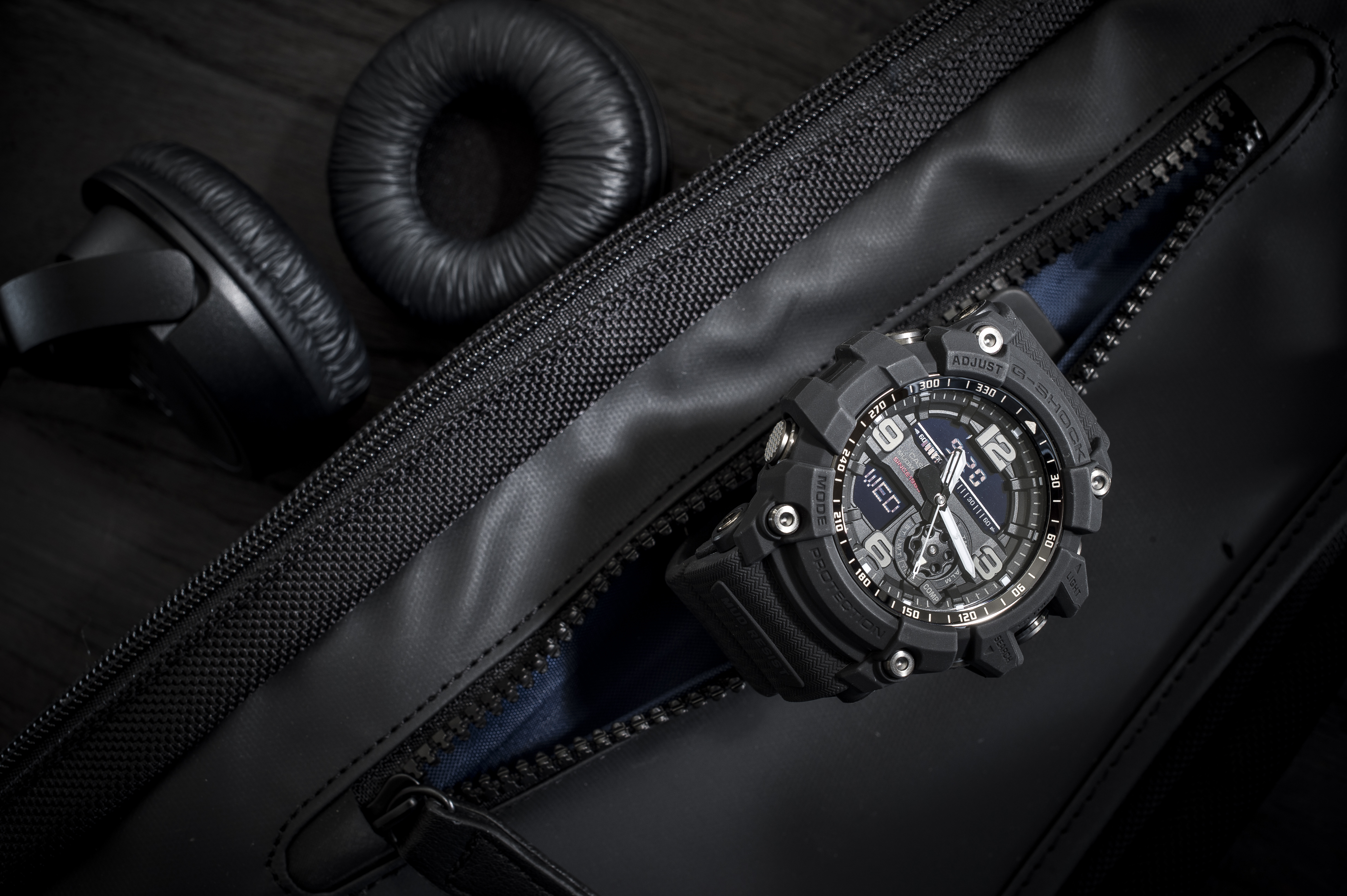 マスターオブGシリーズ「MUDMASTER(マッドマスター) GG-1000」をベースにした「GG-1035A-1AJR」は、視認性を高めるために幅広の時分針、また、12・3・6・9時位置にはアラビア数字の大型インデックスを採用したモデル。瓦礫や土砂が散乱するような陸上での使用を想定している。ボタンには防塵・防泥性能を可能にするボタンガードシリンダー構造は、ミリタリーテイストなデザインと相まって過酷な状況でのタフな使い方にも耐えうる。