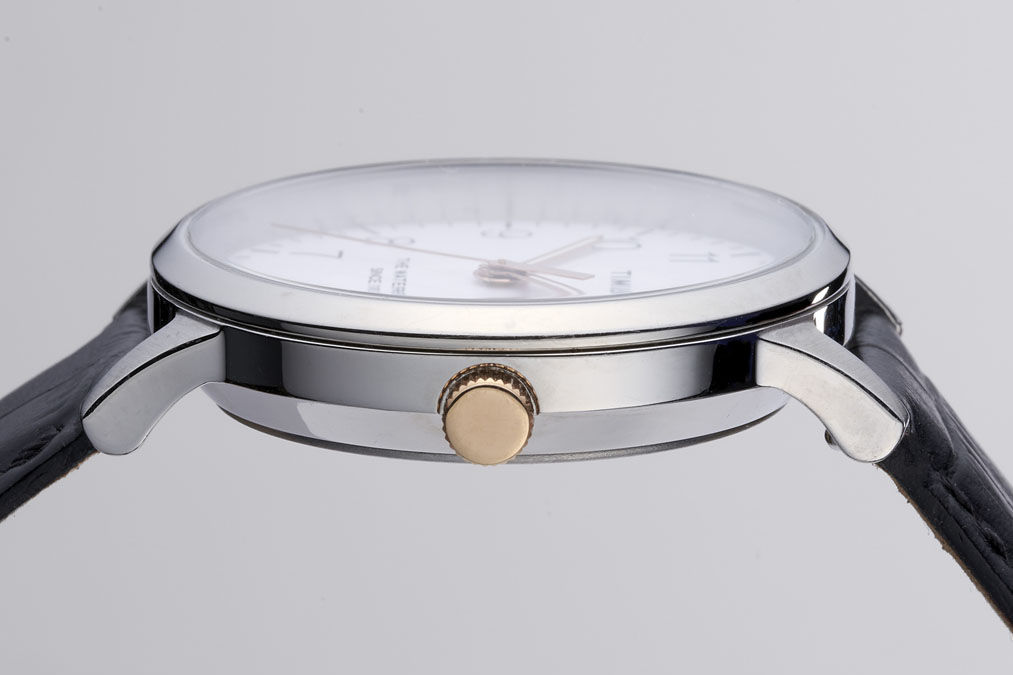 TIMEXの創業地「ウォーターベリー」を冠したコレクション。すっきりとした細いベゼルが印象的。レザータイプは針とリューズにローズゴールドを採用、4月発売予定のブレスタイプは単色でスマートに仕上げている。ケース径36mm、SSケース