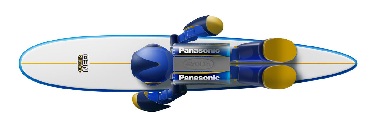 今回のチャレンジにあたり各所を防水処理されたエボルタNEOくん。手でひょいっと持てるほど小さい身長約17cmのロボットが、長さ約35cmのボードに乗り、腕を回して水をかきながら進んでいきます。動力はもちろん単3形エボルタNEOが2本だけ。