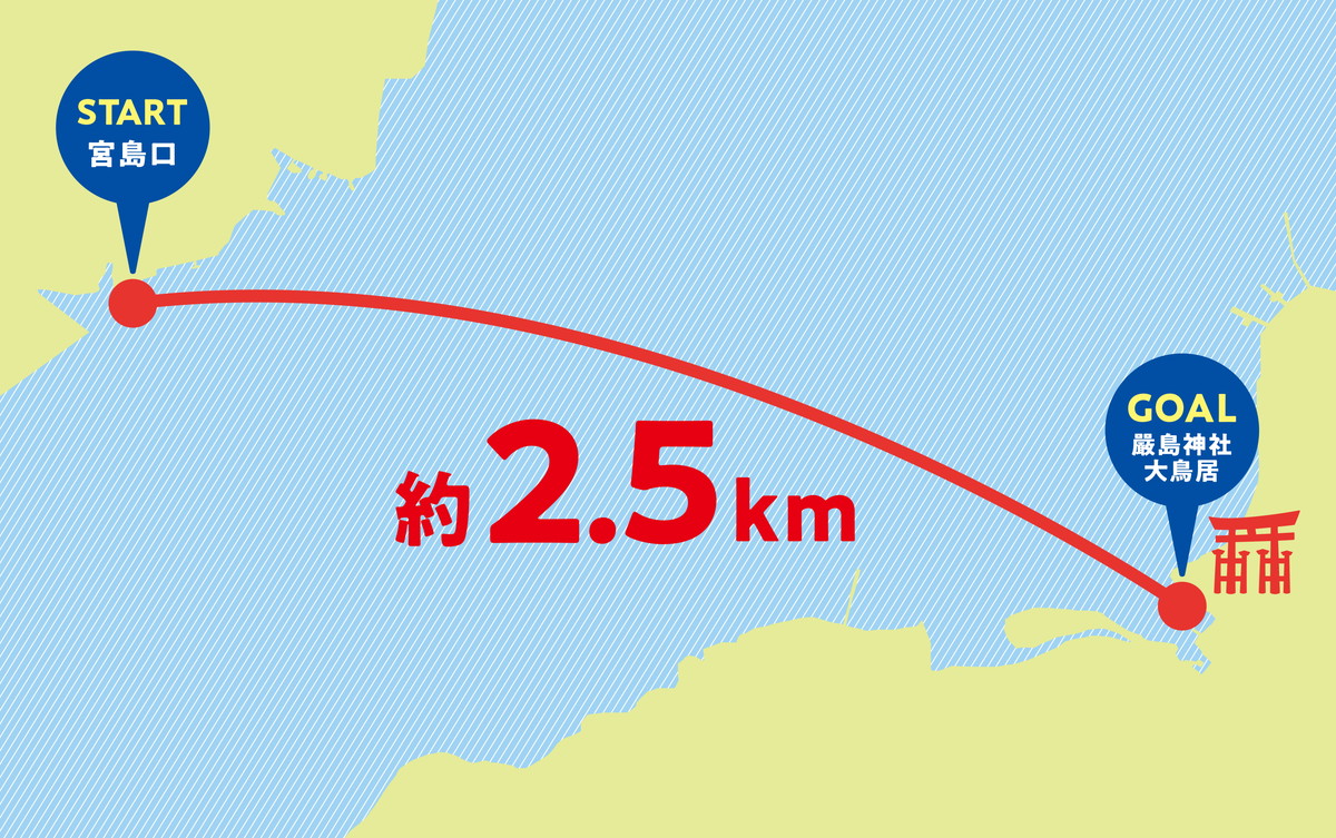 そんなエボルタNEOくんが目指すのは、世界遺産である広島の宮島・厳島神社。対岸となる宮島口(広島県廿日市市)からスタートし、厳島神社の大鳥居まで約2.5kmを泳ぐことになります。