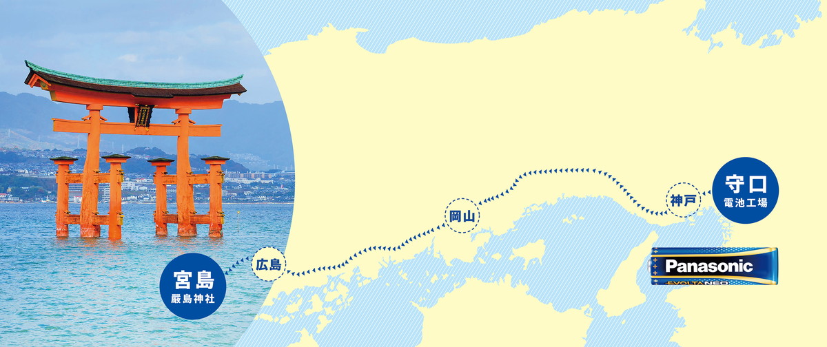 実は今回のチャレンジにあたり、エボルタNEOくんはどうも現地集合を言い渡された模様。今年はパナソニック創業100周年、そして乾電池エボルタが誕生して10年という節目の年になるということで、日頃の愛顧に感謝して、大阪府守口市にあるパナソニックの乾電池工場からチャレンジのスタート地点である宮島口まで、約400kmを自力で移動することになったんだとか。