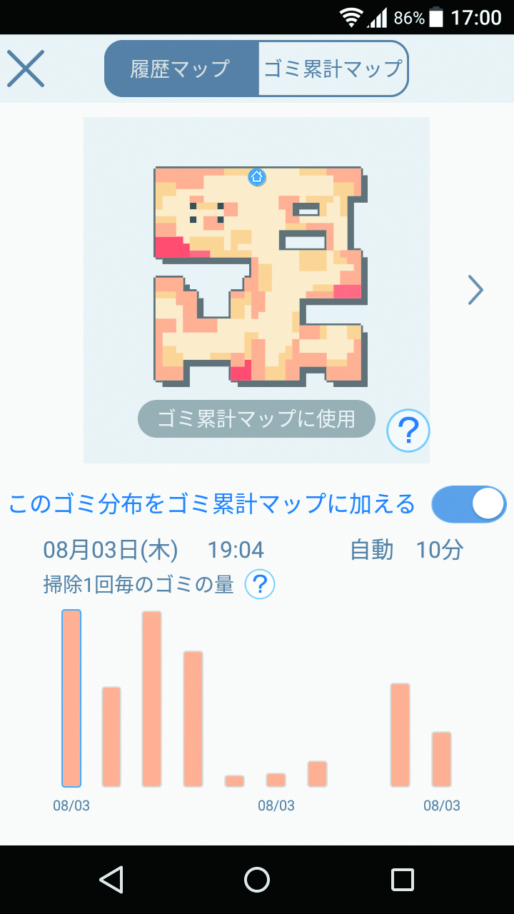 さらに、ゴミの量をマップ上に表示するゴミマップが作成され、スマートフォンアプリでゴミのたまりやすくなっているところをチェックできるほか、汚れやすいところだけを掃除するお手軽モードや、ペットのゲージがある場合など、掃除したくないエリアを指定することもできる。