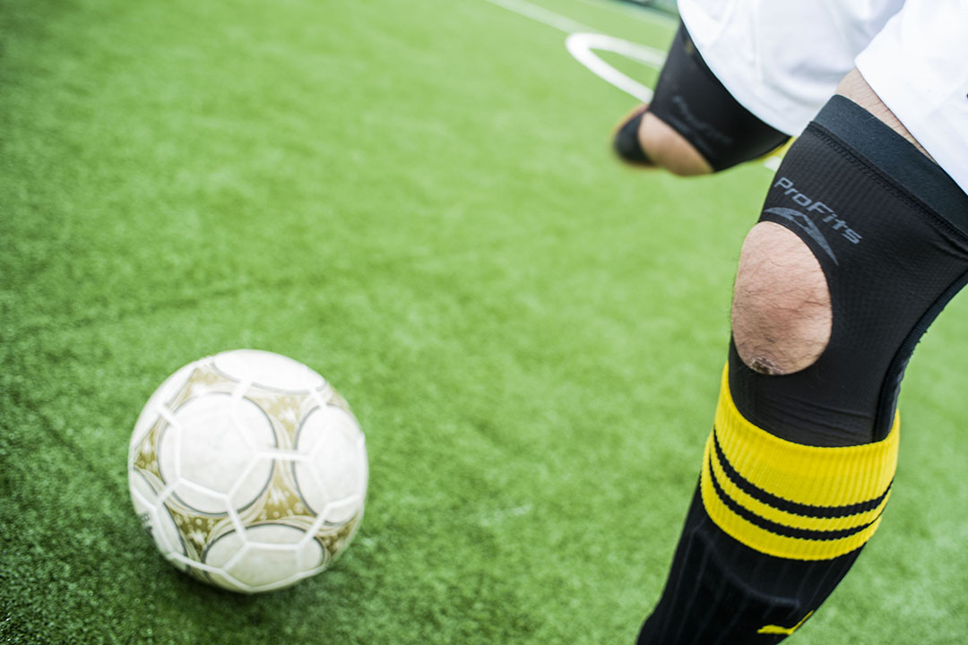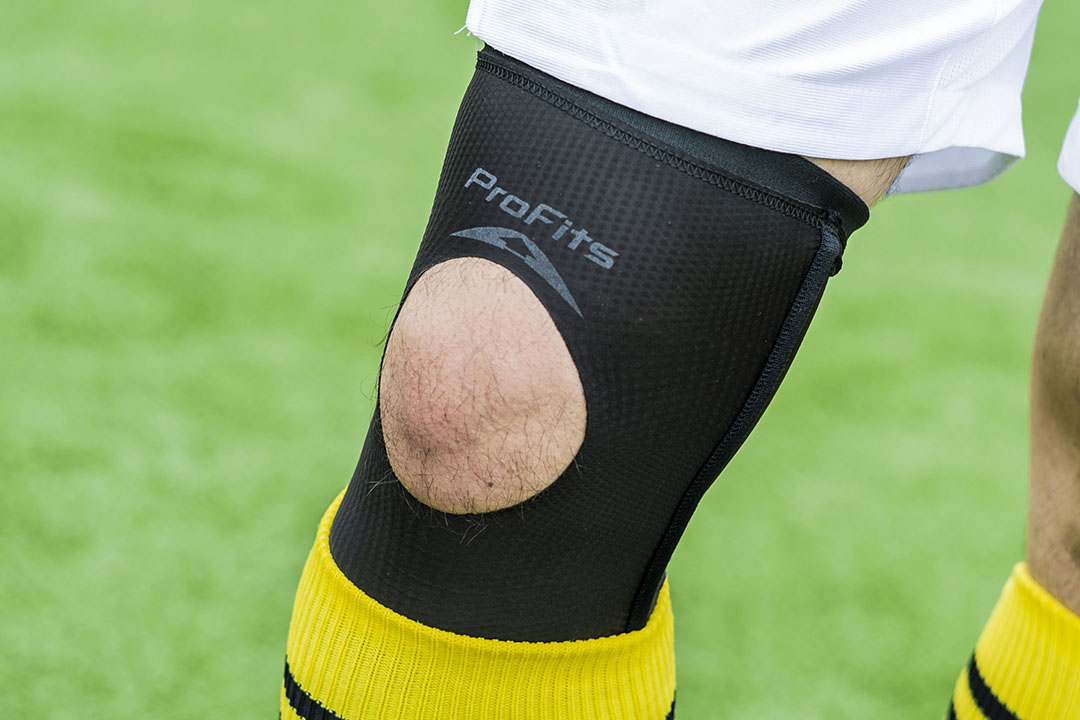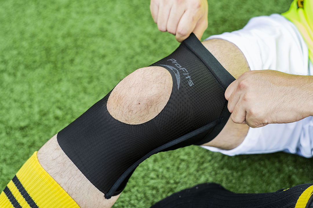 フットサルではひざに負担がかかることが多いため、今回は、最新技術を駆使して作られた薄型 圧迫固定サポーター「プロ・フィッツ サポーター ひざ用」を使用しました。